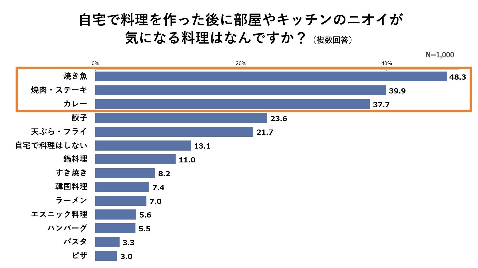 次に、「自宅で料理を作った後に部屋やキッチンのニオイが気になる料理はなんですか?」と聞いたところ、半数近くの人が「焼魚」と回答、次点で「焼肉・ステーキ」、「カレー」がニオイの気になる料理として選ばれました。