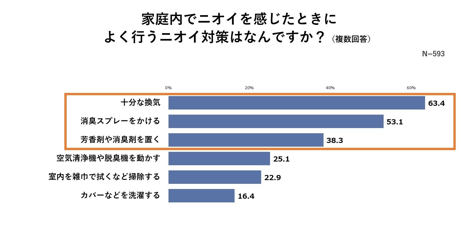 《家庭で実施しているニオイ対策で最も多いのは「十分な換気」(63.4%)。