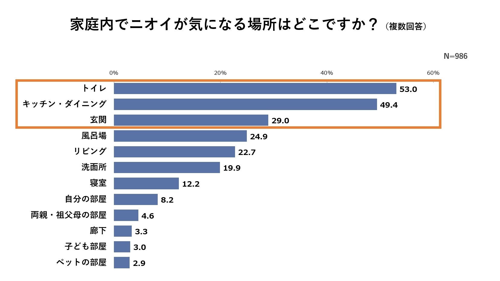 《自宅のニオイが気になる場所1位は「トイレ」(53.0%)、次いで「キッチン・ダイニング」(49.4%)、「玄関」(29.0%)という結果に》