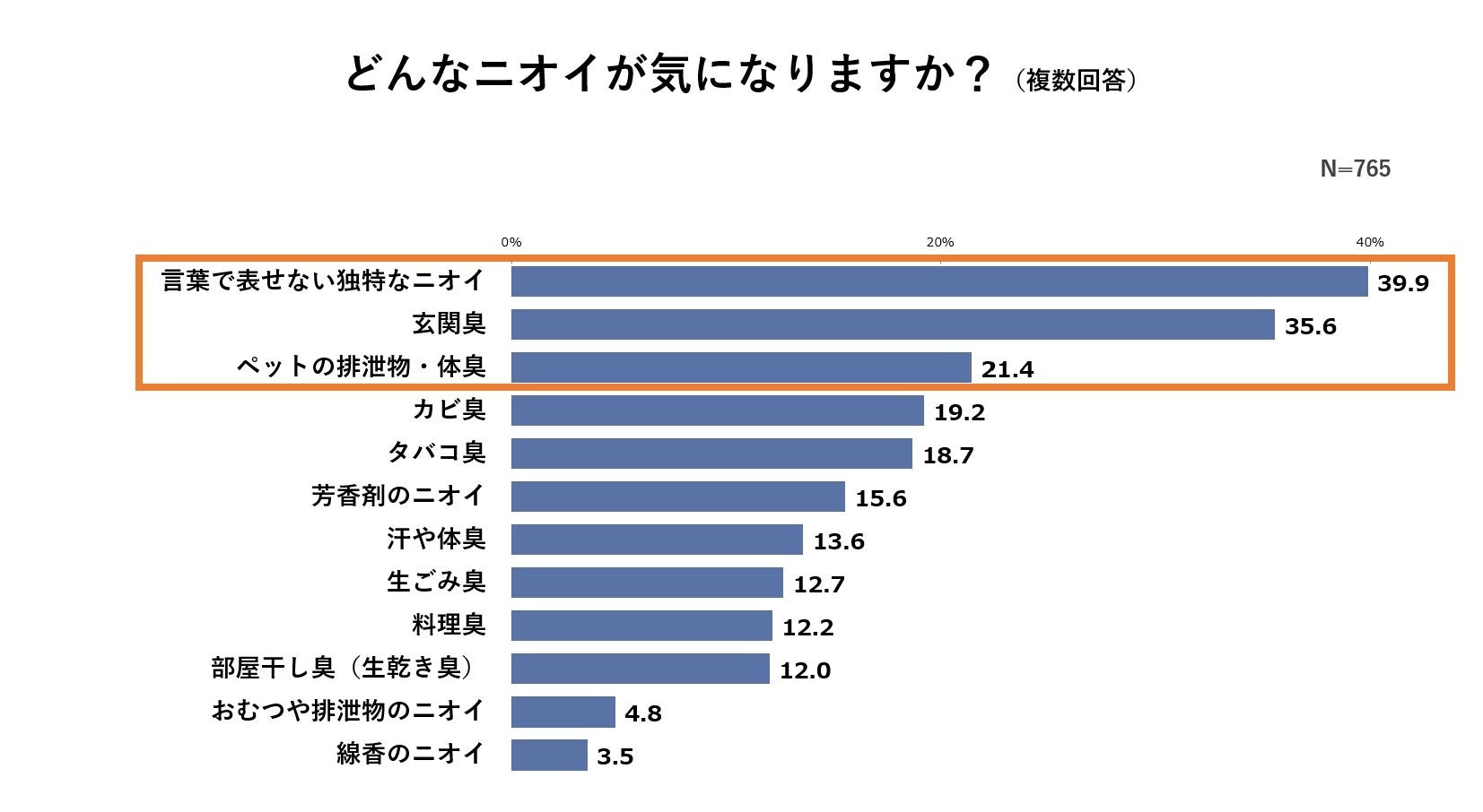 次に、「他人の家に行ったときにニオイが気になったことがありますか。」と聞いたところ、「かなりある」「たまにある」を合わせると全体で76.5%の人が他人の家のニオイが気になったことがあると回答。さらに、どんなニオイが気になるかを聞いたところ、「言葉で表せない独特なニオイ」が39.9%で1位、次点で「玄関臭」、「ペットの排泄物・体臭」と続きました。