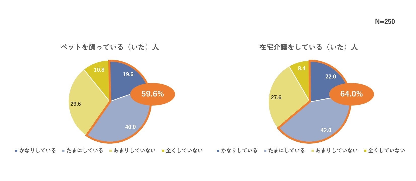 その中でも、在宅介護をしている(いた)人は「かなりしている」「たまにしている」を合わせると64.0%、ペットを飼っている(いた)人は59.6%という結果に。ペットを飼っている人や在宅介護をしている人は、自宅をより清潔に保ちたいという想いからニオイ対策の意識が高い傾向にあることがわかりました。