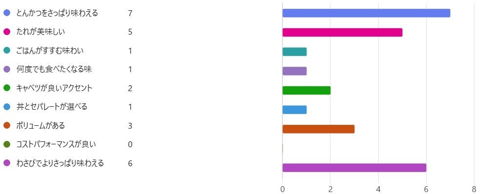 最も多くの票を集めたのは『とんかつをさっぱり味わえる』というポイントでした。以下2位は『わさびでよりさっぱり味わえる』、『たれが美味しい』でした。