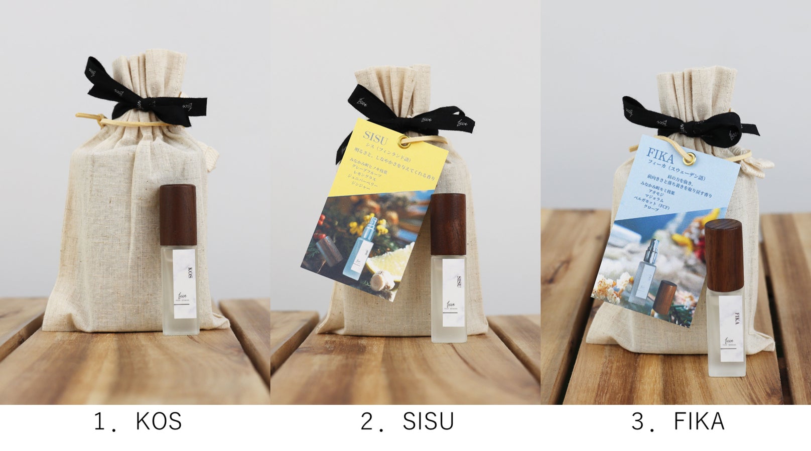 SISU = 力強さ、ガッツ、度胸(フィンランド語)の意味をもつ香りです。困難にも粘り強く立ち向かう勇気を与えてくれるような、前向きな気持ちになりたい時などにおすすめです。日頃の疲れが内に溜まってうまくリフレッシュできない時、不安な気持ちを吐き出せない時に、そっと心をほぐしてくれるような香りです。