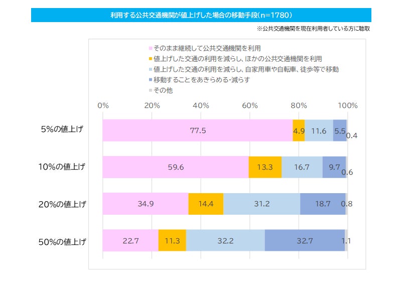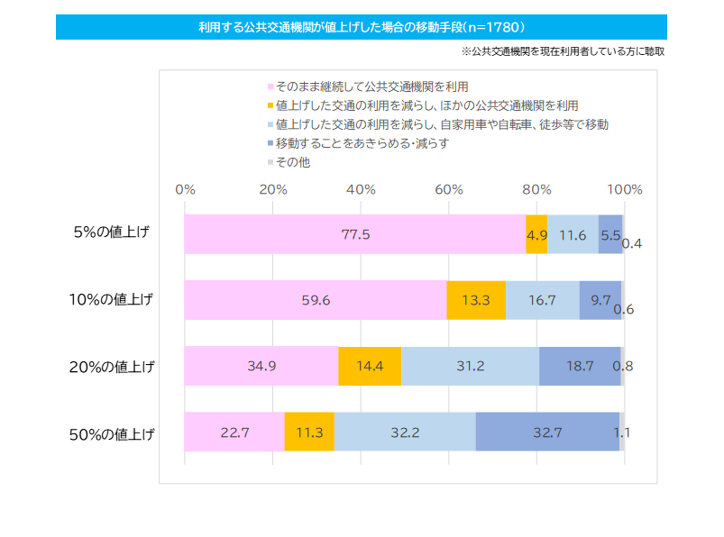運賃が上昇した場合、値上げ幅が大きくなるにつれて継続利用は減少し「自家用車や自転車、徒歩等で移動」「移動することをあきらめる・減らす」が増加