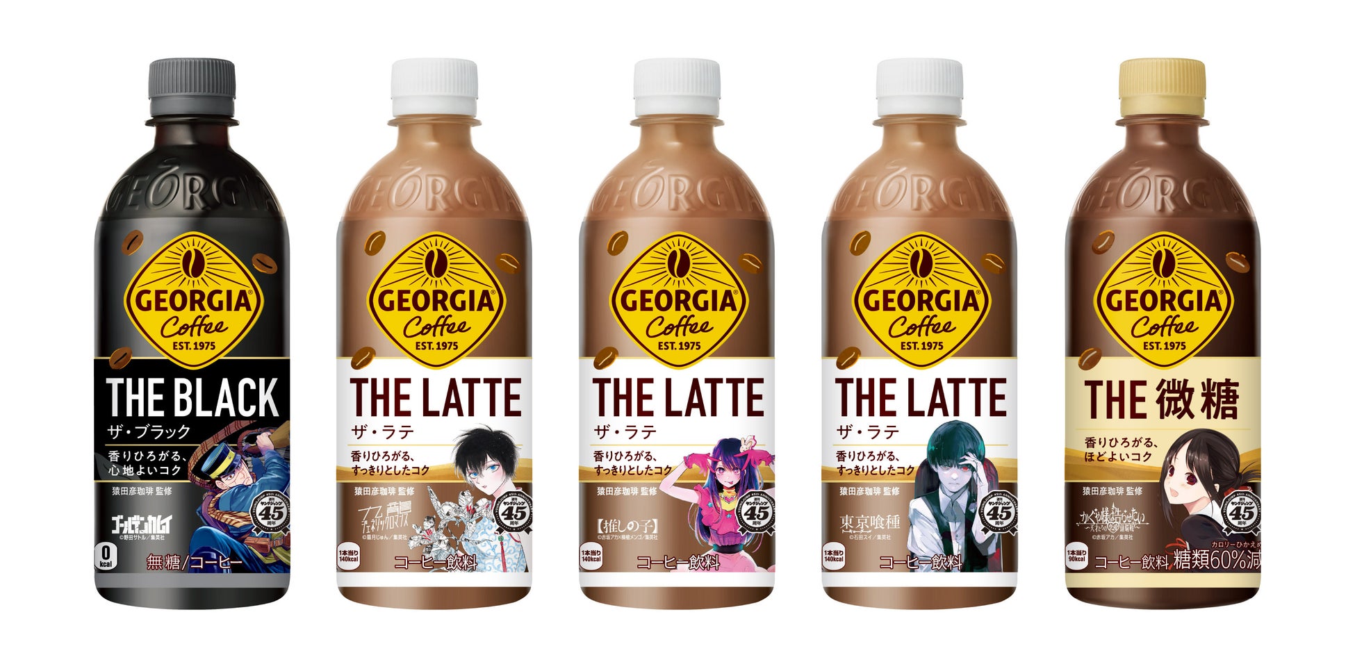 「ジョージア」は、「週刊ヤングジャンプ45周年」とコラボレーションしたコラボデザインボトルを7月15日(月)から数量限定で発売します。「【推しの子】」、「かぐや様は告らせたい~天才たちの恋愛頭脳戦~」、「九龍ジェネリックロマンス」、「ゴールデンカムイ」、「東京喰種トーキョーグール」の人気5作品のキャラクターが「ジョージア THE ラテ」、「ジョージア THE ブラック」、「ジョージア THE 微糖」3製品のパッケージに各15種のデザインで登場します。“五感を刺激する”コーヒー体験をコンセプトとする