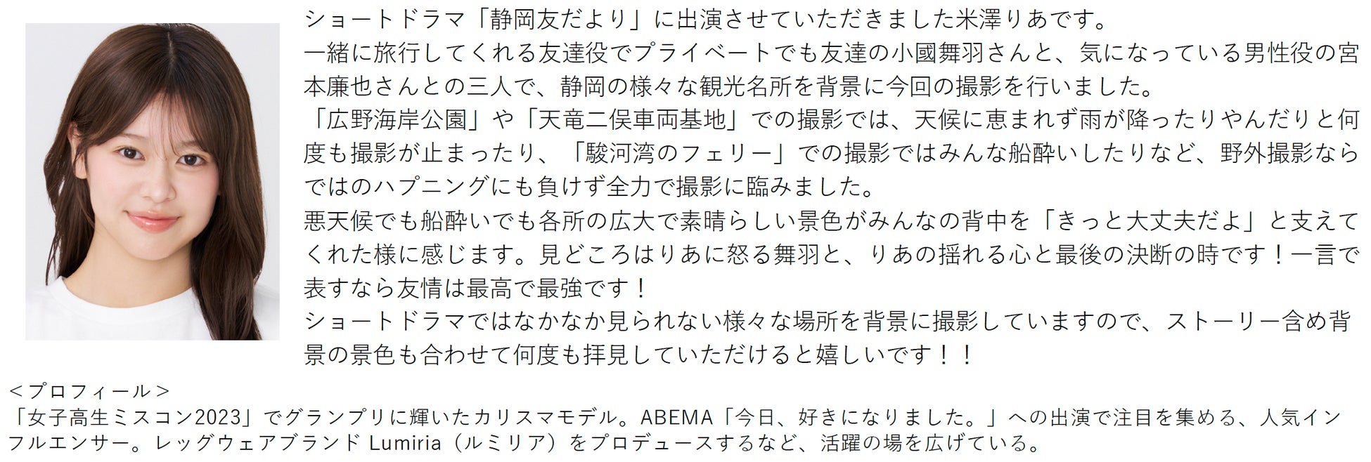 今回配信した縦型ショートドラマ『静岡友だより』は前編・後編の合計2本。いずれも1分程度のドラマとなっており、1月8日(木)の配信開始から、わずか1日で総再生回数は200万回を突破しました。主演は、『Seventeen』専属モデルとして活躍する一方、ABEMAの大人気恋愛番組『今日、好きになりました。』で人気を集めた小國舞羽と、「女子高生ミスコン2023」でグランプリに輝いたカリスマモデルで、同じくABEMAの大人気恋愛番組『今日、好きになりました。』で注目された米澤りあの、Z世代から大人気の2人が務め、静岡の名所を舞台に恋に夢中になりすぎて親友との関係がギクシャク…?!そんな誰もが経験したことがあるような、親友とのすれ違いを描いた友情ストーリーです。