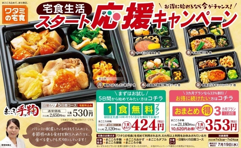 「ワタミの宅食」では毎日約24万食のお弁当・お惣菜をお届けしており、2010 年から 2022年まで13 年連続で、病者・高齢者食宅配市場「売上シェアNo.1」を達成しました。高齢者を中心に健康的な食生活を支えるインフラとなっております。本キャンペーンは、より多くのお客さまに食生活を整えるきっかけを提供させていただきたいという思いのもと、まずはおためしいただける「1食無料プラン」から、最大6カ月間まで割引価格でご利用いただける「おまとめ🉐(まるとく)プラン」をご用意しました。