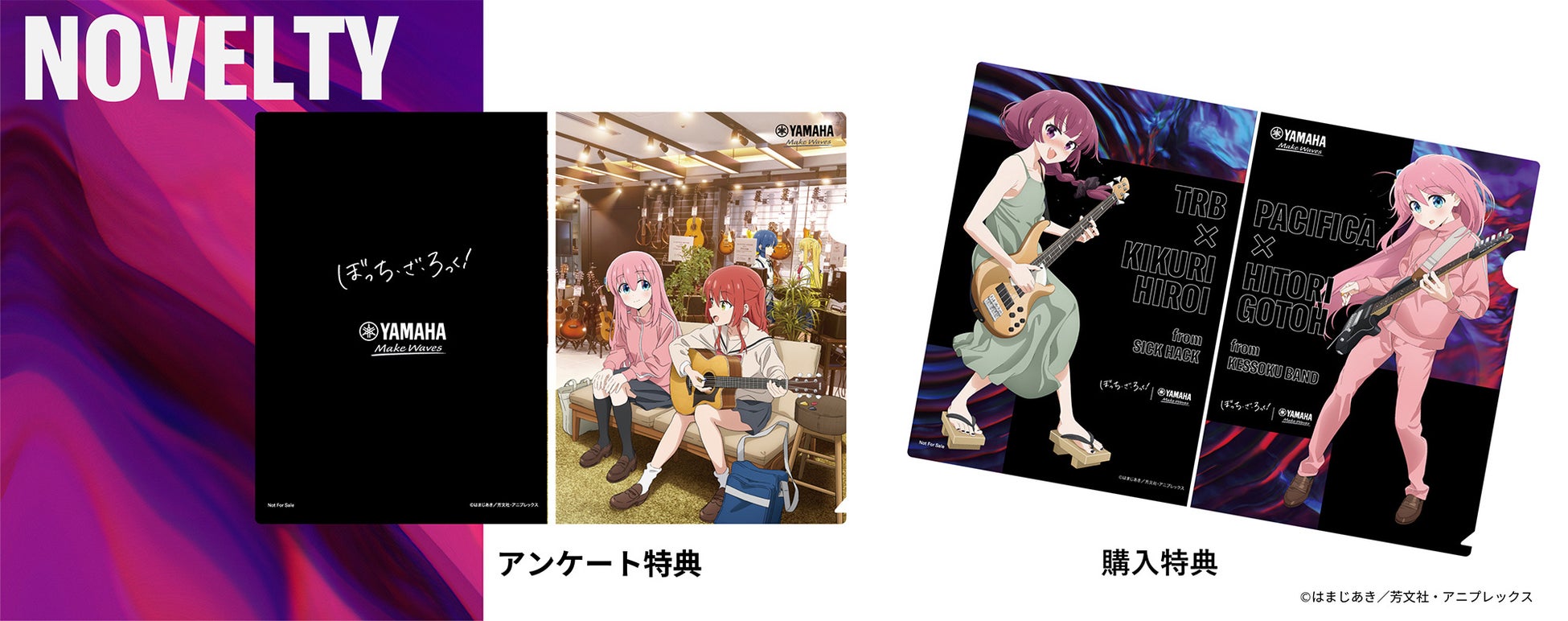 施設内のQRコードからアンケートを回答いただいた方に、クリアファイルをプレゼントします。また、対象のヤマハ楽器特約店またはヤマハのオンライン書店「Sheet Music Store」で、ヤマハ・アニメ「ぼっち・ざ・ろっく!」関連商品を3,000円以上購入いただいた方に、クリアファイルをプレゼントします。詳細はウェブサイトをご確認ください。