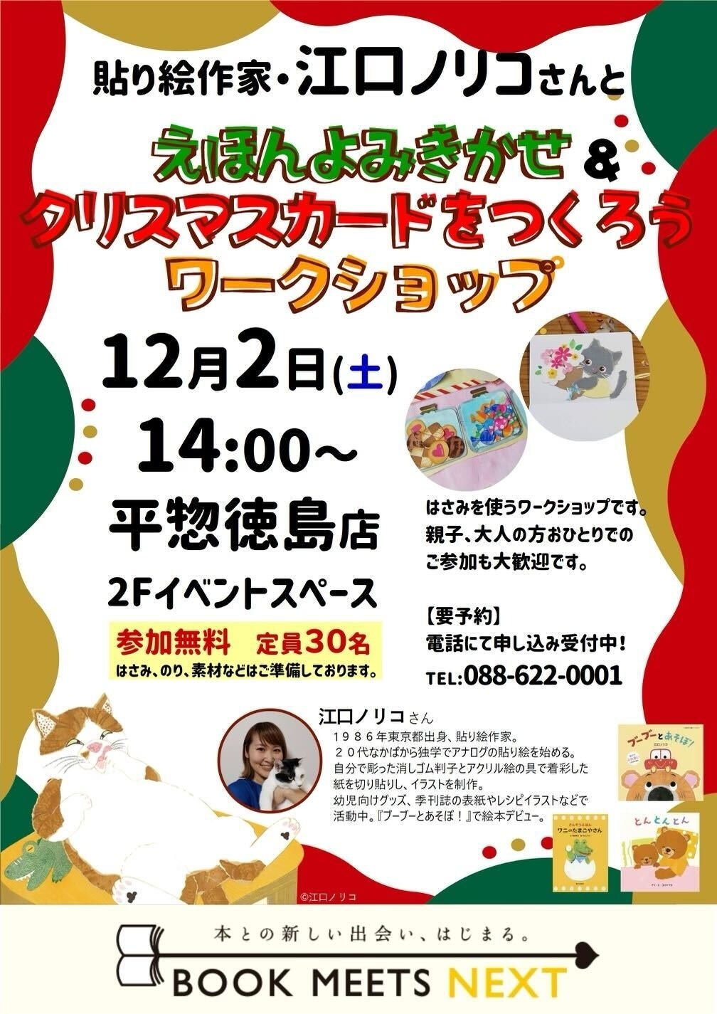 『とんとんとん』の発売にあわせて、12月2日(土)14:00〜平惣徳島店にて江口ノリコさんの絵本読み聞かせ会とクリスマスカードをつくるワークショップを開催いたします。親子はもちろん、大人の方お一人でもご参加いただけるイベントです。ぜひご参加ください。