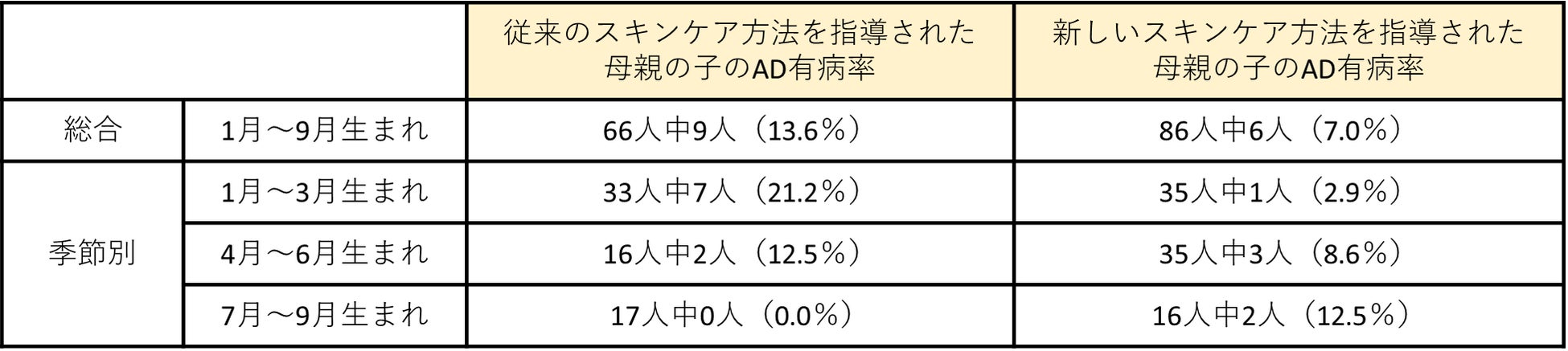 本研究結果は、乾燥した寒い時期に生まれた子どもについては、低刺激な洗浄と保湿によるスキンケアにより、ADを予防できる可能があることを示しています。