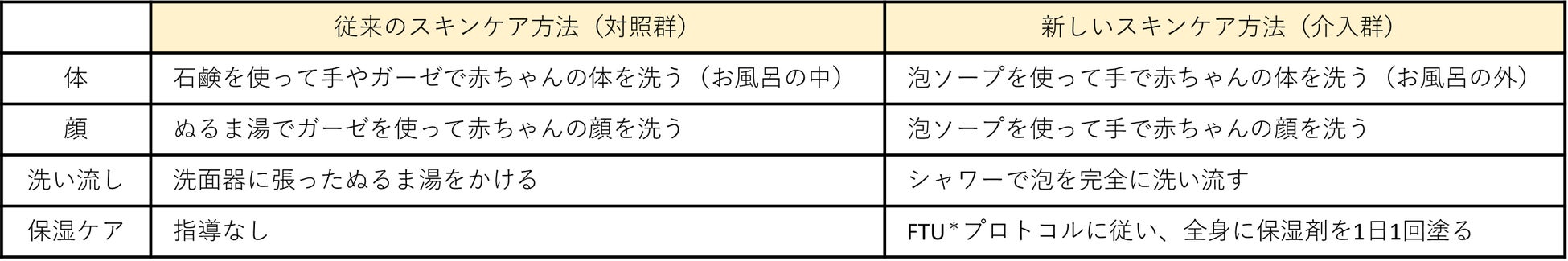 2019年1月~9月生まれの子どもの母親へは従来のスキンケア方法(対照群;132名)を、2020年1月~9月生まれの子どもの母親へは新しいスキンケア方法(介入群;140名)を指導(指導内容は下記)し、生後12か月時のAD有病率についてアンケート調査を行いました。