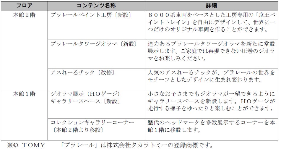 れーるランドでは、より多くのお子さまが楽しめるように、本館2階のコンテンツの入替えを行い、新たに「プラレールペイント工房」や「プラレールタワージオラマ」を設置するほか、既存の「アスれーるチック」についてもプラレールをモチーフとしたアスレチックに変更するなど、フロアの一部をリニューアルします。また、本館1階についても、ジオラマ展示(HOゲージ)のギャラリースペースや、ヘッドマーク等を展示するコレクションギャラリーコーナーを新設します。