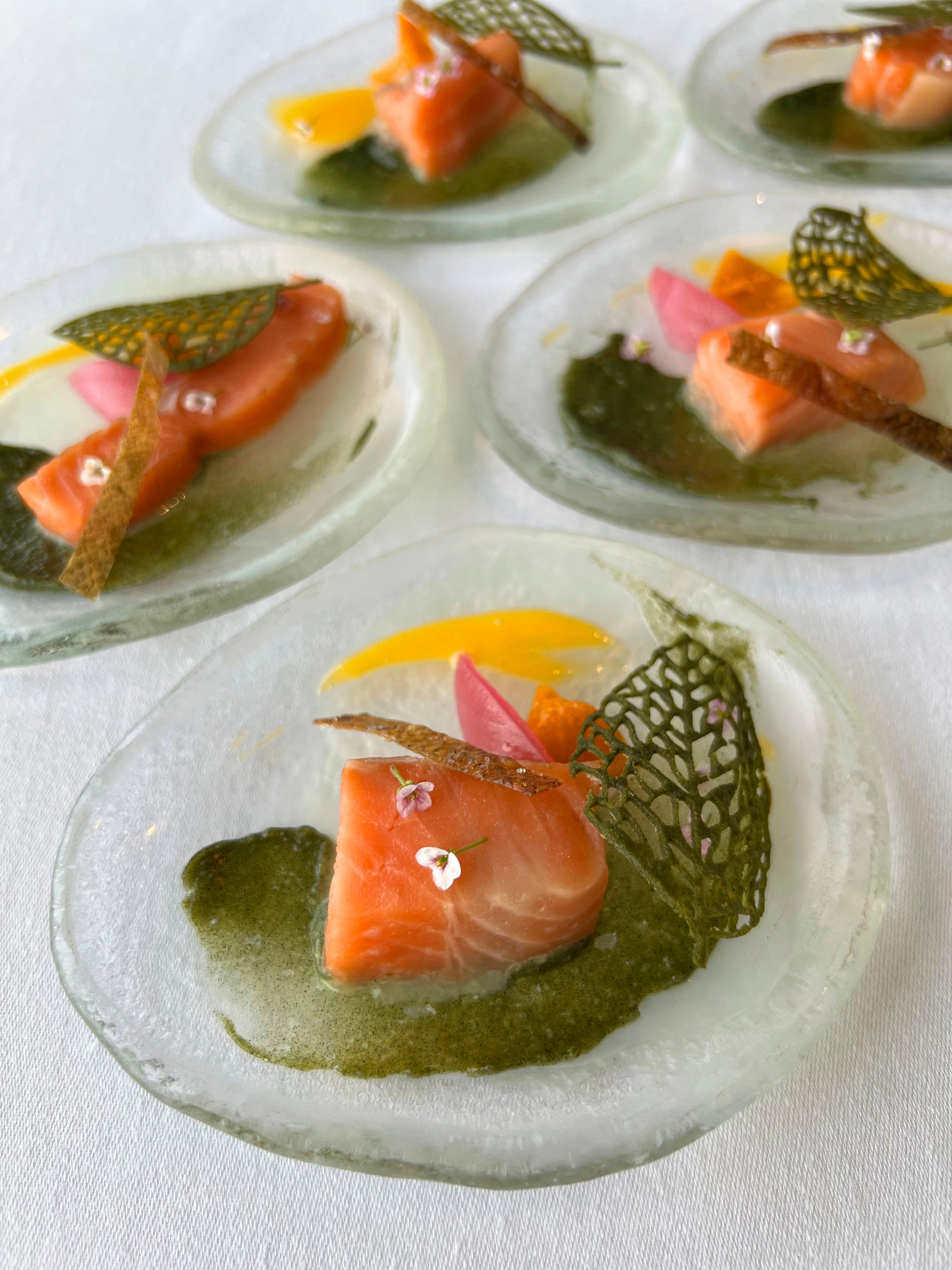 [メニュー] 多気サステナブルサーモンの低温調理伊勢茶や牛脂を使ったチュイル(焼き菓子)、セミドライ