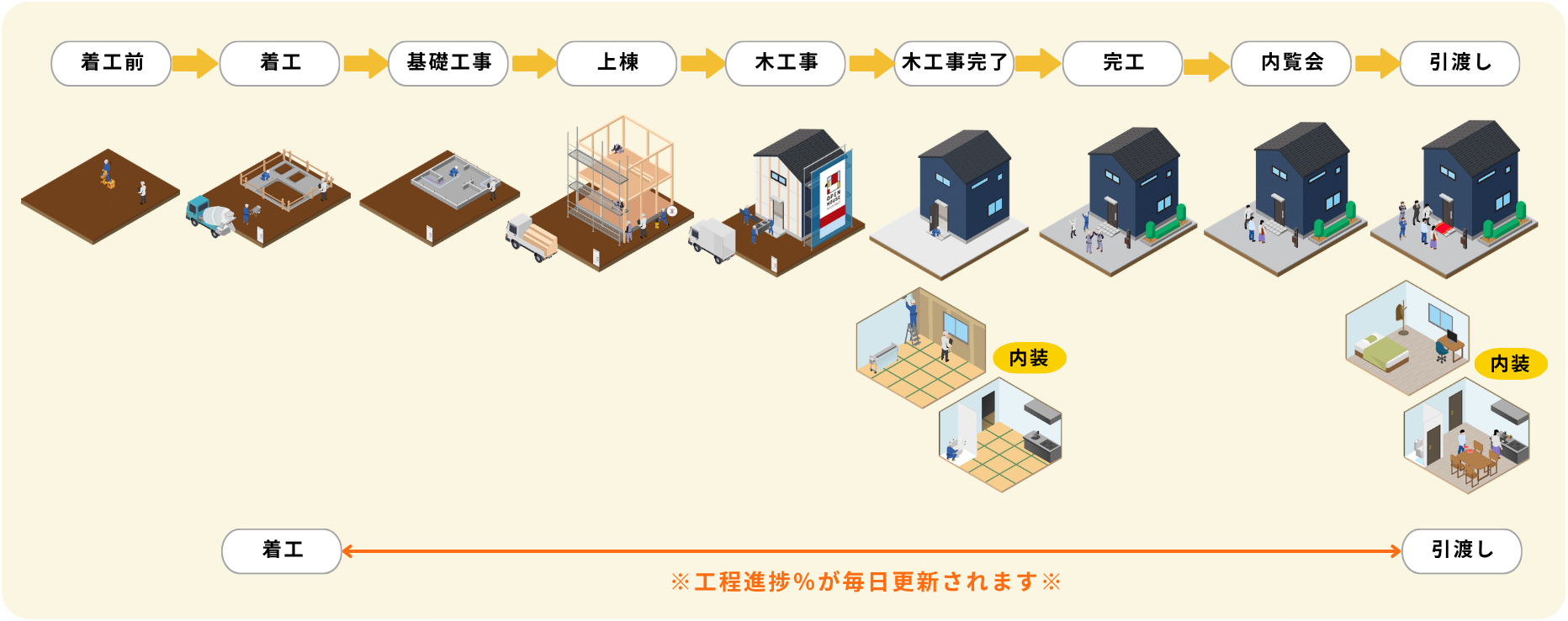 屋根やお家の形状、カラー、階数、バルコニーのあり・なしなど、お客様の住宅の特徴に沿ったイラストで建築過程をシミュレーションします。また、着工前からお引渡しまで、全9工程の進捗に合わせてミニチュア風のイラストや背景が変化するほか、現場で働く大工や業者のイラストがかわいらしく動き、家を造る方々へ親近感を醸成します 。