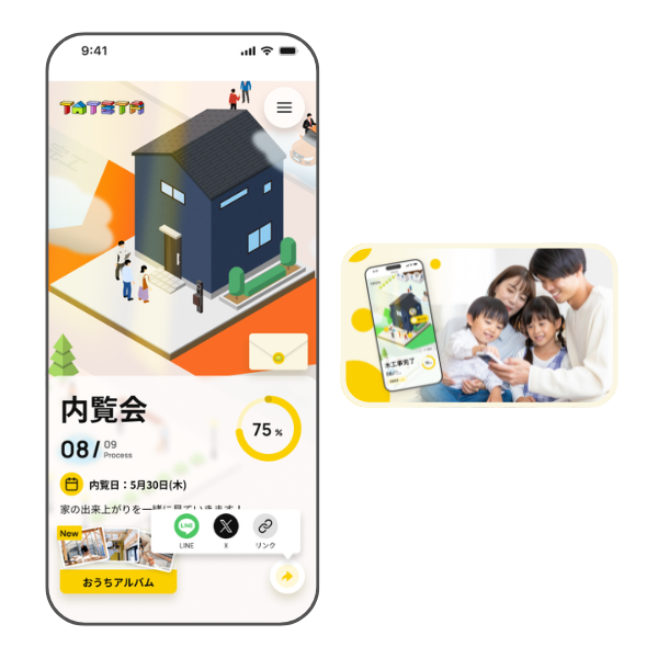 進捗画面をSNSでシェアし、ご家族やご友人へ建築中の家の状況を簡単に共有することができます。
