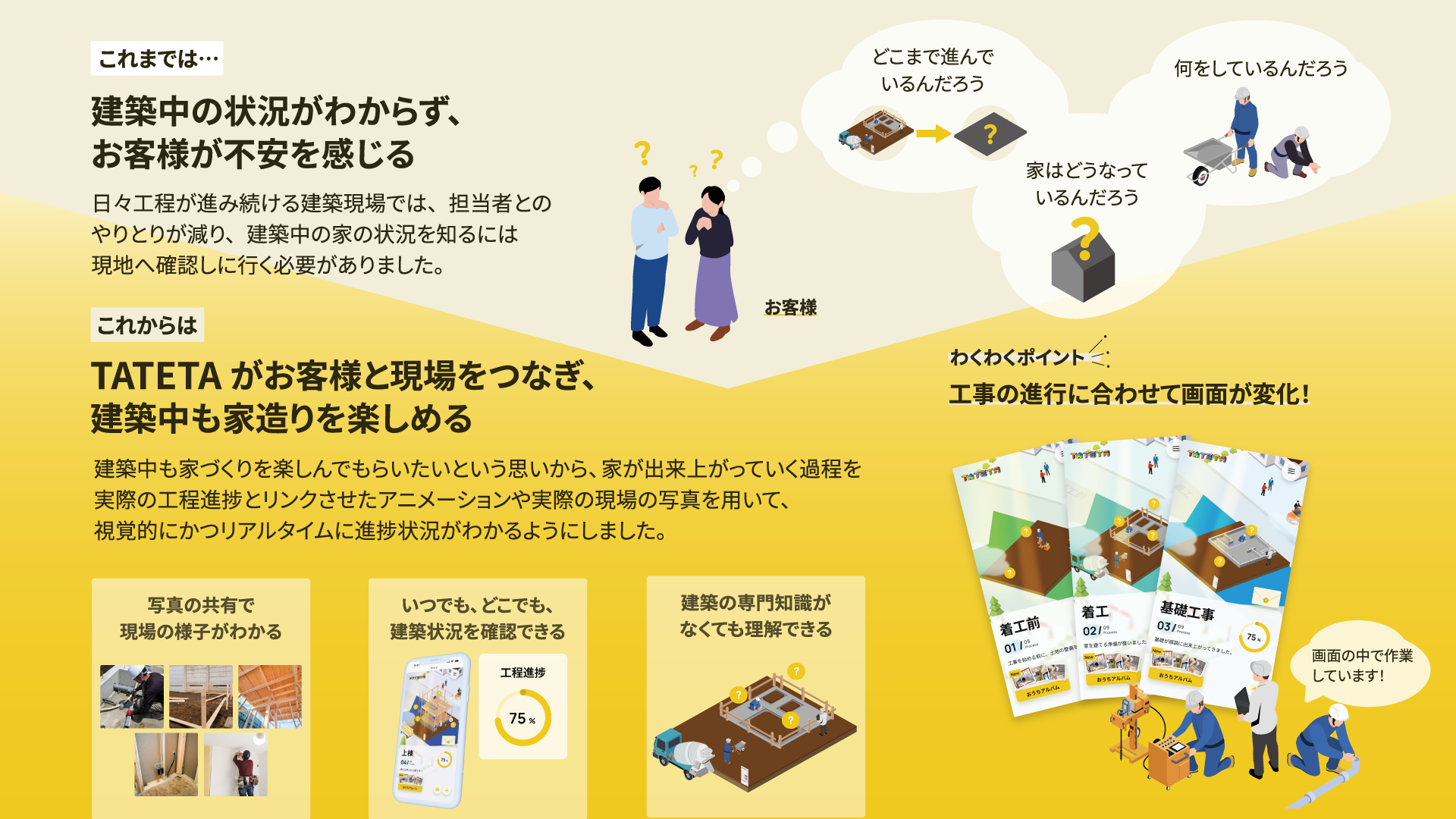 アニメーション内の「?」マークをタップすると、専門的な工事内容を写真付きで分かりやすく解説します。建築知識がない方でも「今、何をしているのか」を正しく理解でき、不安を納得と安心に変えることができます。