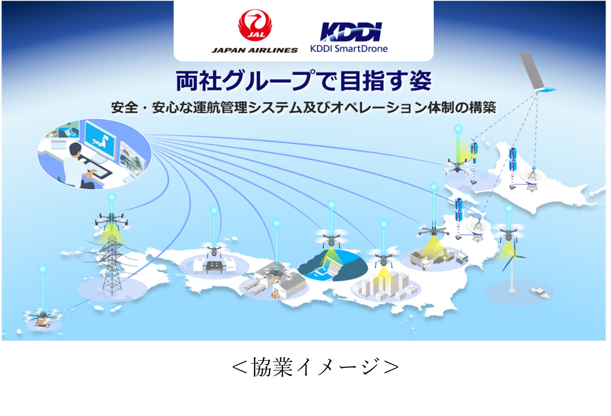 JALが培ってきた空の移動に関わる安全管理などの航空運送事業の技術・知見と、KDDIとKDDI スマートドローンのドローンの飛行制御から空域管理までを実現する運航管理システムや通信インフラ、そして各社が蓄積してきたドローン運航に関わるノウハウを活かして、高度なドローン活用の実現と利用の拡大に向けた取り組みを加速すべく、提携に至りました。