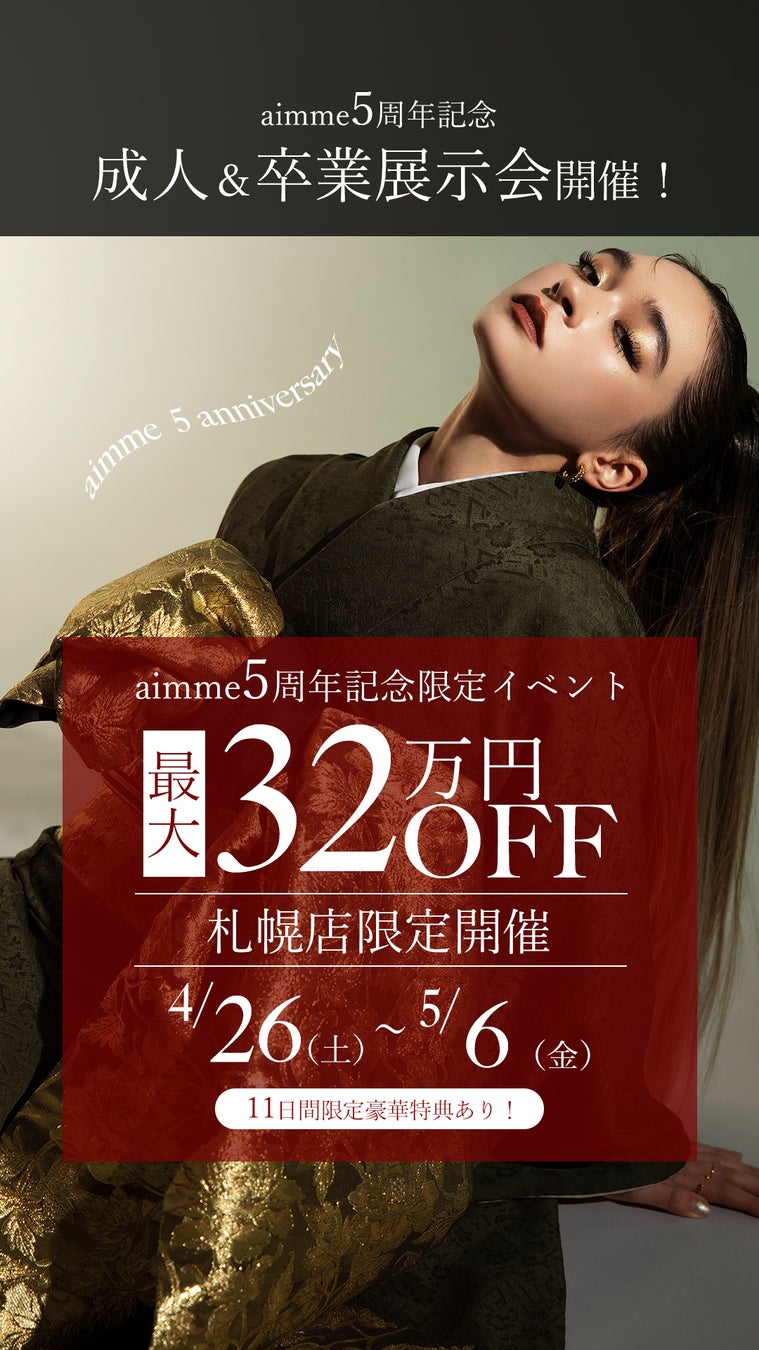 今年で10代から20代女子の支持率NO1フォトスタジオのaimme(エイミー)が5周年を迎えることを記念し、5周年イベント「振袖&卒業袴展示会」の開催が決定いたしました!