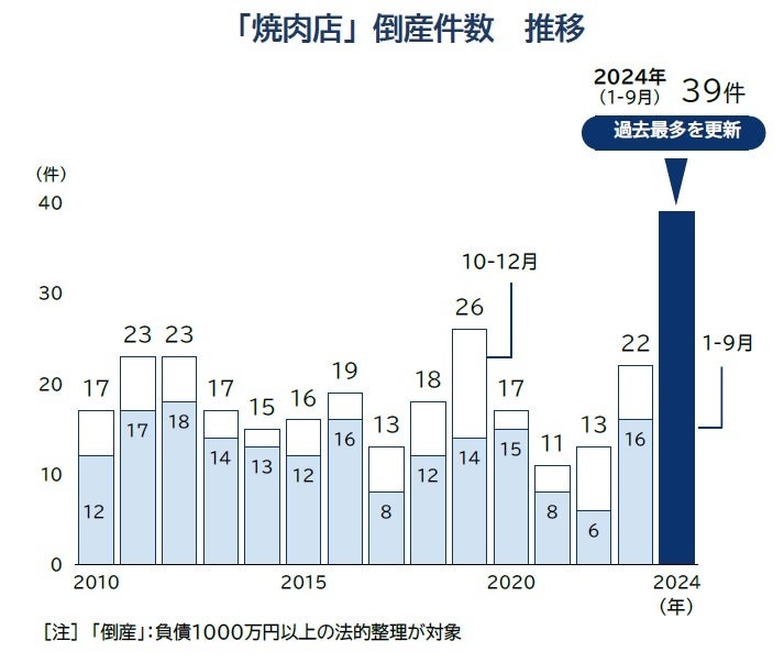 焼肉店の倒産が年間最多を更新した。2024年に発生した「焼肉店」経営事業者の倒産(負債1000万円以上、法的整理)は、9月までに計39件にのぼった。2023年の同期間(16件)から倍増したほか、7月末時点で2019年通年の件数(26件)を上回り年間で過去最多を更新した。ただ、個人営業など小規模店の廃業を含めれば、実際はより多くの焼肉店が市場から退出したとみられる。