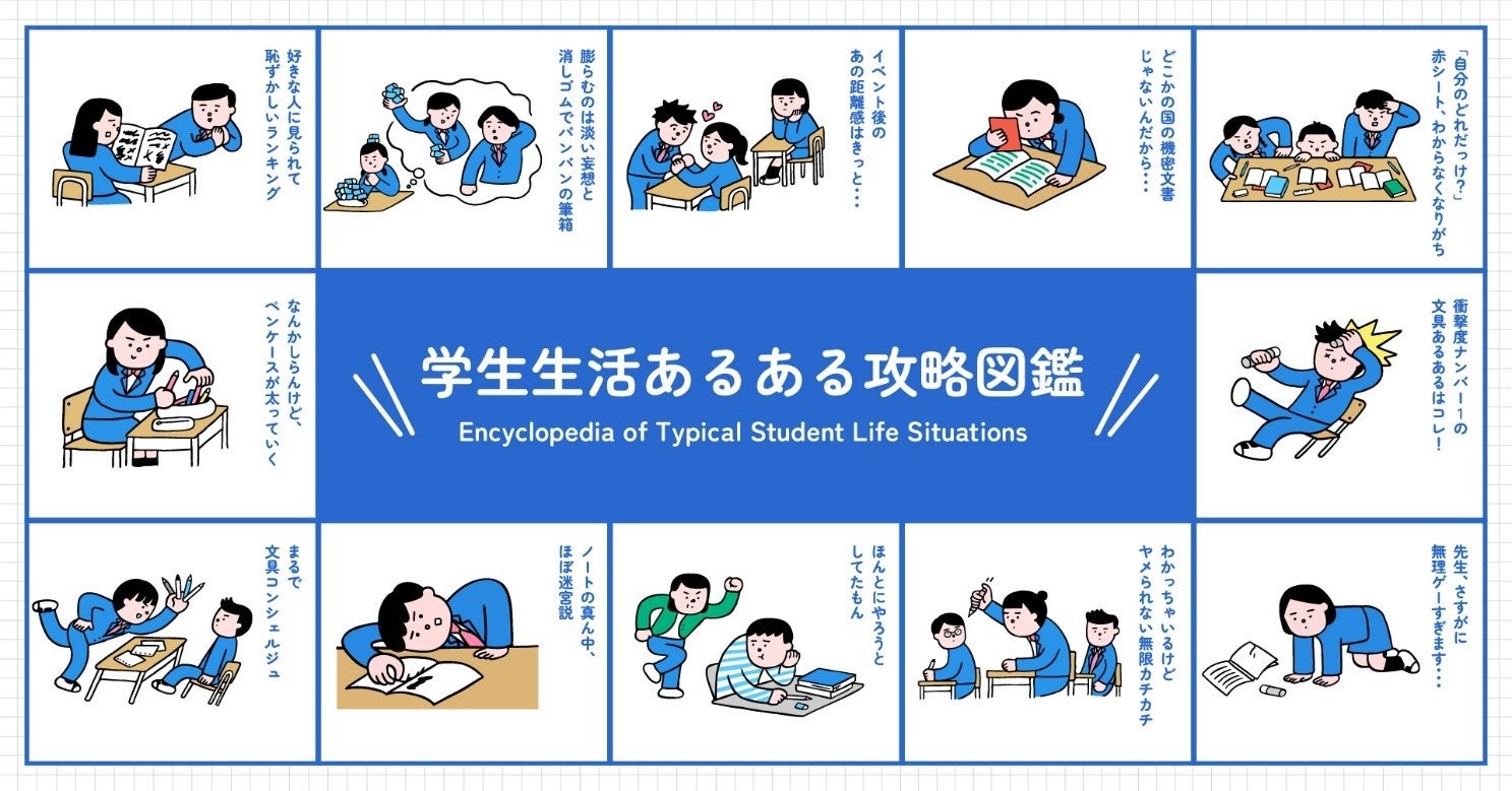 そこで、機能的で学生にとって身近な存在である文房具が、「あるある」な困り事の解決に役立つことを伝えるため、学生生活における「あるある」な困り事や経験を、図鑑形式でまとめ、文房具での攻略方法を示したWEBコンテンツ「学生生活あるある攻略図鑑」を公開します。