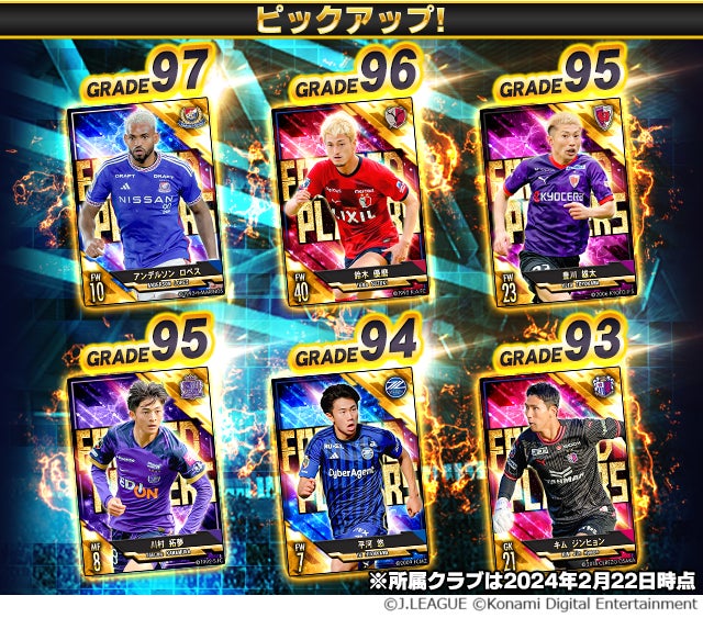本キャンペーンでは、Jリーグ各クラブの試合で活躍し、注目を集めている選手 総勢40名が「フォーカスドプレーヤー第2弾」として登場するほか、『Jクラ』配信開始5周年を記念してミッションをクリアすると「G85以上レギュラー2024ガチャ券」などのアイテムが手に入る「Jクラ5周年記念!特別ミッション」や「フォーカスドプレーヤー第2弾」の選手カードが登場し、「センススロット強化ソックス(大)×50」などのおまけが手に入る「Jクラ5周年記念!フォーカスドプレーヤー第2弾福袋ガチャ」を開催しています。