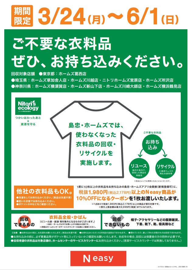 【島忠】初の衣料品回収を3月24日(月)より、N easy取扱い9店舗にて実施!クーポンもプレゼント。