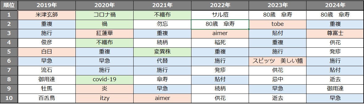 2024年3位は「尊富士」、2021年1位は「不織布」、2019年1位は「米津玄師」。「読み方」と一緒に検索されがちなキーワードは「重複」「施行」「早急」など
