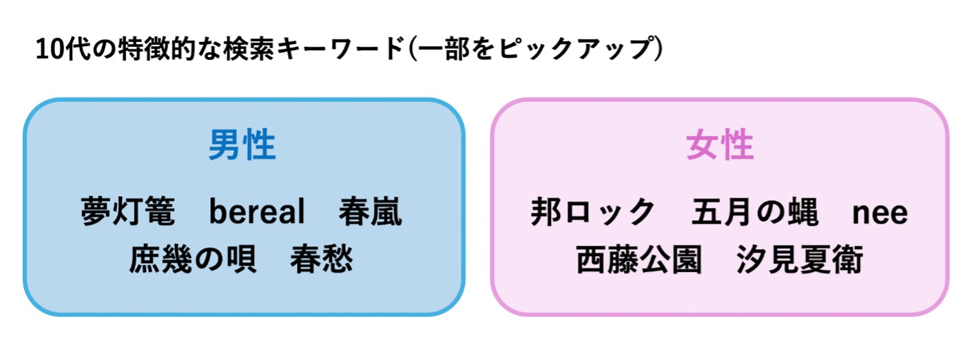 続いて、性年代別に「読み方」を含む特徴的な検索キーワードを抽出し分析したところ、各性年代での興味関心の特徴が見えてきました。10代男女は「夢灯篭」「五月の蝿」「春愁」など、RADWIMPSやMrs. GREEN APPLEといった人気の“邦ロック“アーティストの楽曲に関心を持っていることがわかります。