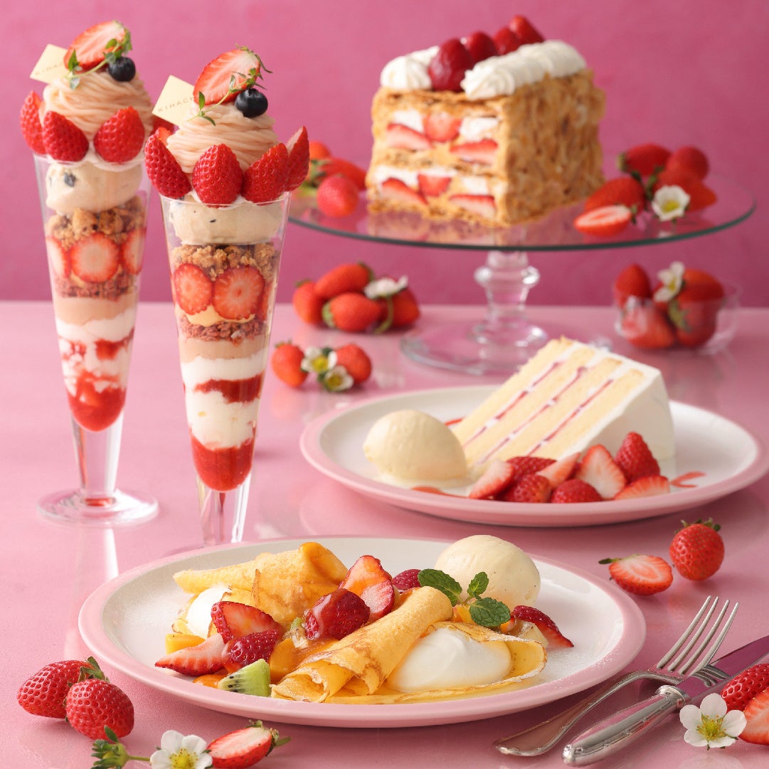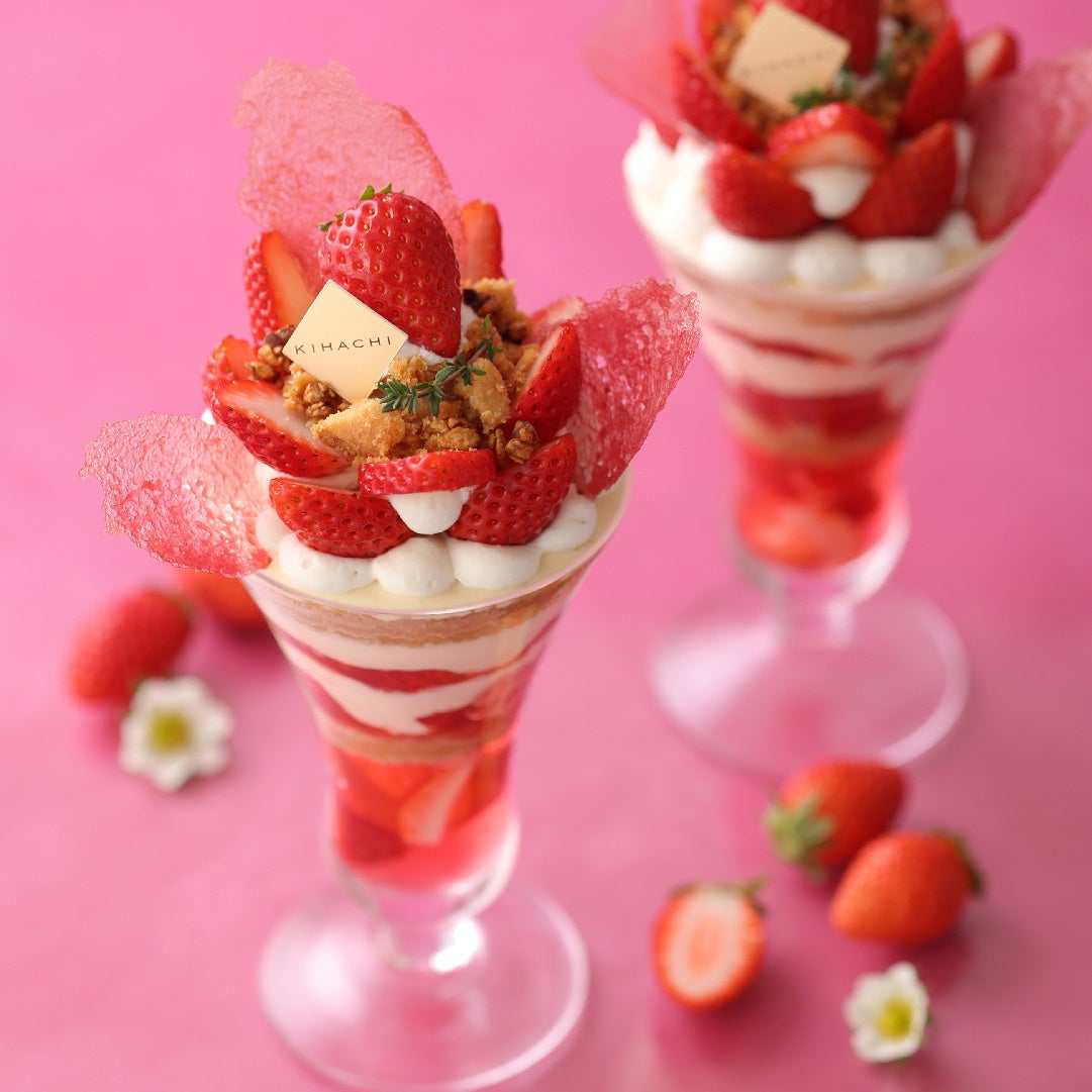 苺パフェのほかにも、焦がしバターでこんがり焼き上げた自家製クレープに、苺、バナナ、パパイヤ、キウイを添えた「苺と彩り果実のクレープ アプリコットソース」、キハチを代表する「KIHACHIのナポレオンパイ」、フェアの後半に展開する「苺のショートケーキ バニラアイス添え」、キハチ自慢のスイーツを一度にお楽しみいただける「季節のAfternoon Tea Set」など、苺シーズンにふさわしい多彩なラインアップをご用意しました。