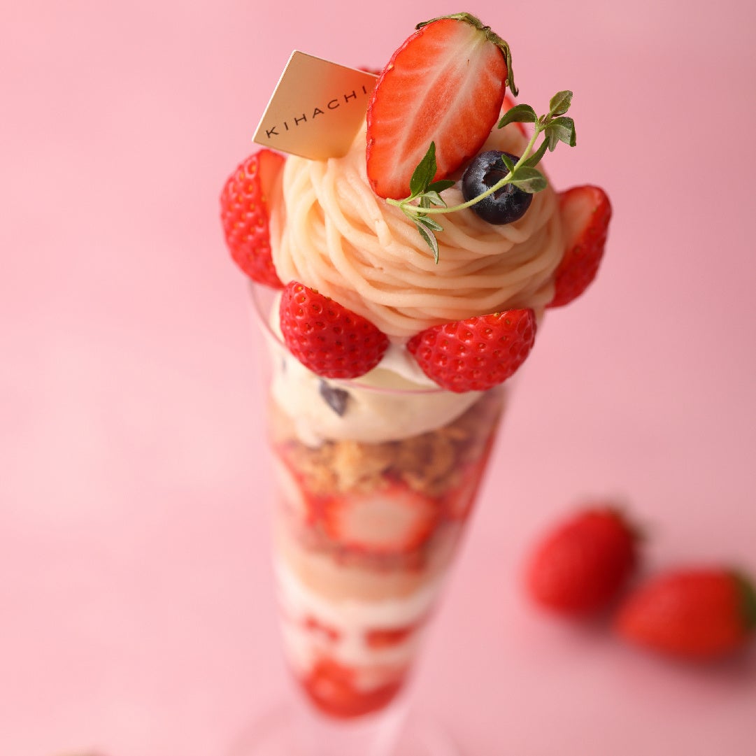 国産苺と黒豆きなこアイスに、ザクザク食感のクランブルとプラリネ、甘酸っぱい苺のクランチ、優しい甘さのパンナコッタを合わせ、いちご餡クリームで春色のモンブランパフェに仕立てました。