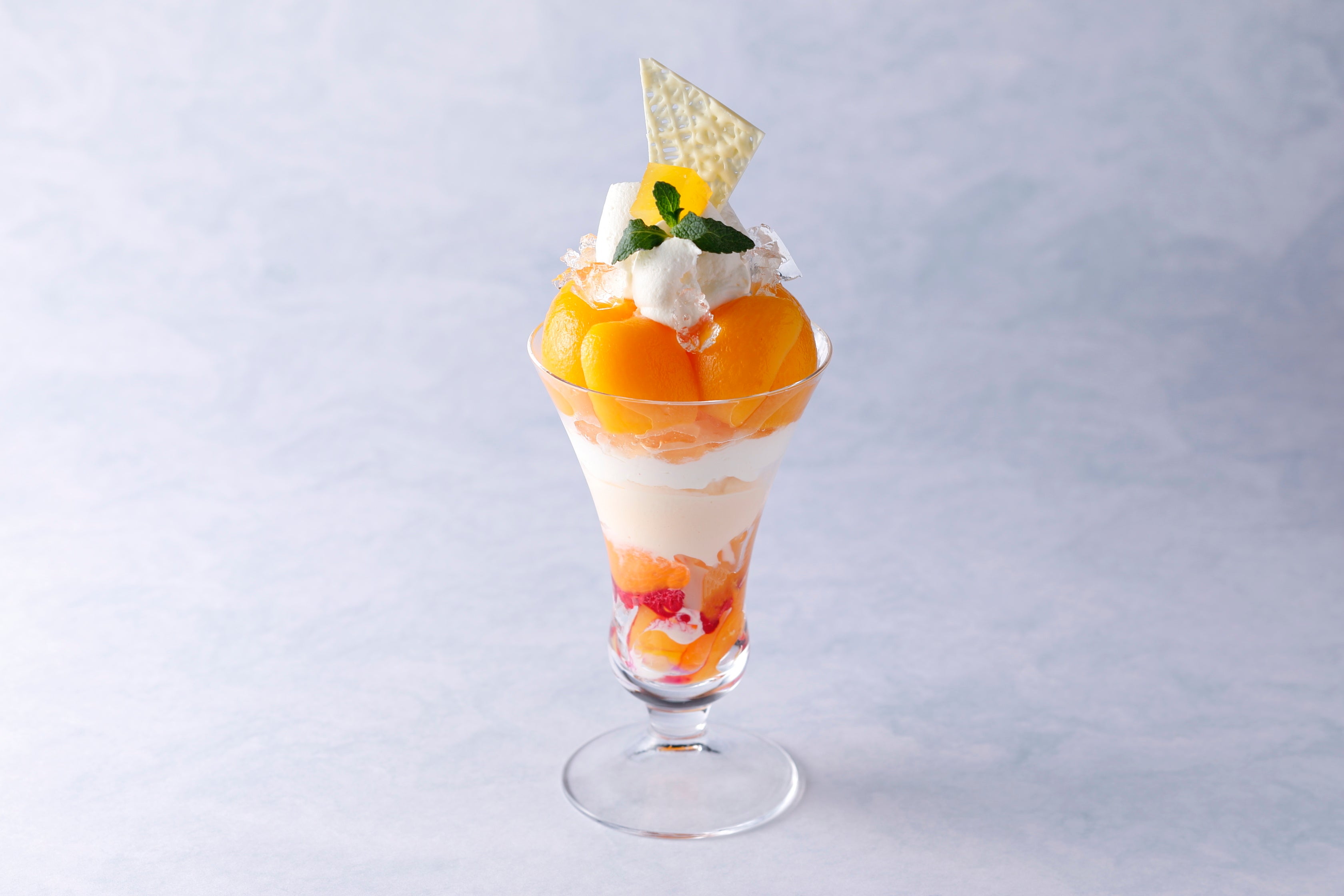九州産の「枇杷(びわ)」は温暖な気候と、海からの風に包まれて育ちます。初夏の訪れとともに甘くてジューシーな味わいを楽しめるパフェに仕立てました。 ※アルコールを使用しております。