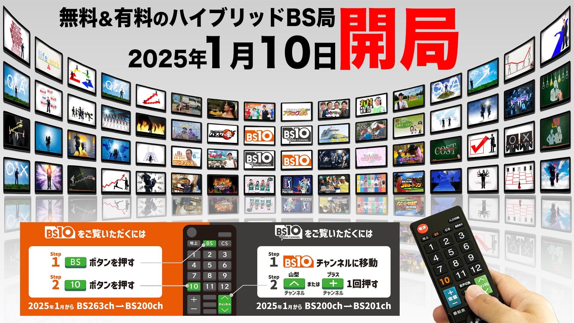 株式会社ジャパネットホールディングス(本社:長崎県佐世保市/代表取締役社長 兼 CEO:髙⽥旭⼈)のグループ会社でBS放送事業を担う株式会社ジャパネットブロードキャスティング(本社:東京都中央区/社長執行役員:佐藤崇充)はBS10の“10”にかけて2025年1月10日(金)(※1)に新しいBS放送局『BS10(ビーエステン)』を開局いたしますのでお知らせいたします。