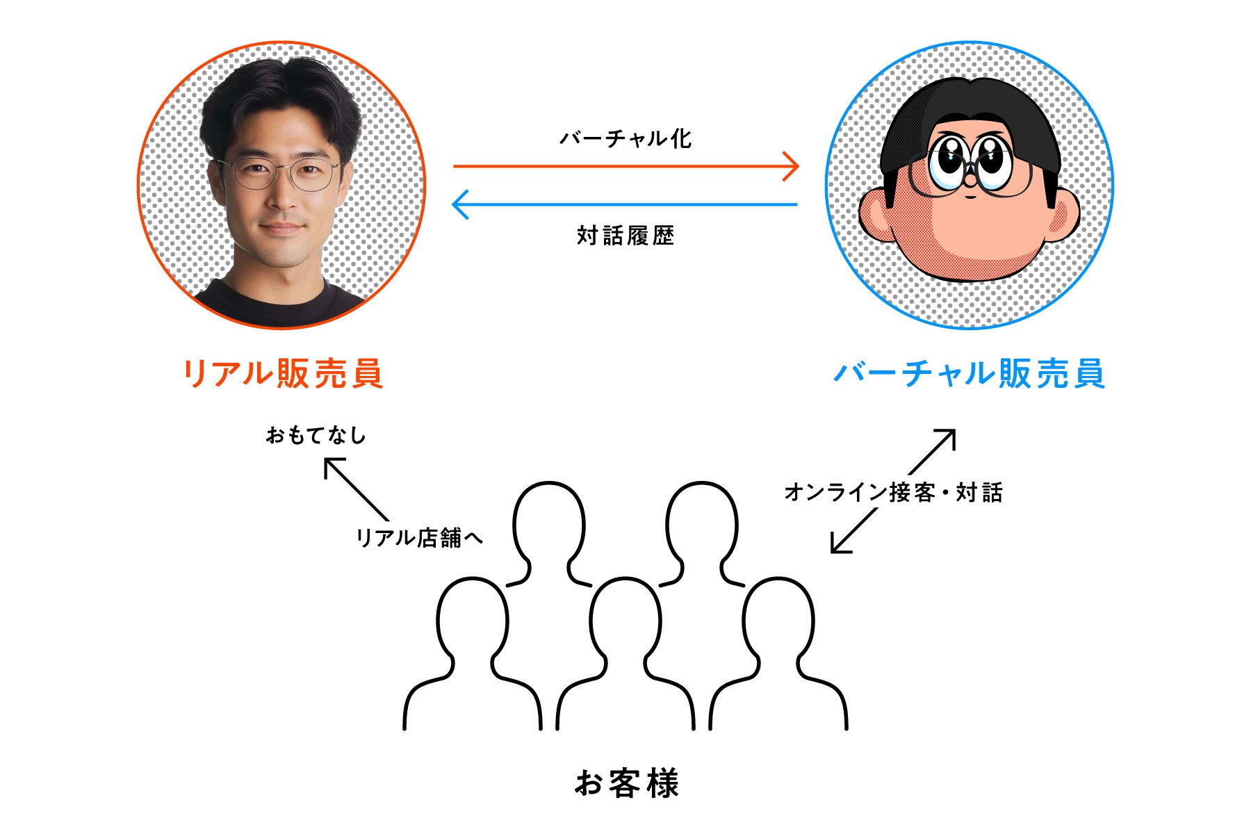 またリアルの販売員をバーチャルアバター化し、オンライン上でバーチャル販売員が接客・対話をした後にリアル店舗へ誘導。オンラインでの対話履歴をリアル販売員へ連携することで、リアル販売員は顧客ニーズを理解した上で、顧客をおもてなしすることが可能になります。