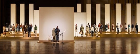 このコレクションは、50 年代から 60 年代にかけてのアイビーリーグのアフリカ系アメリカ人学生のスタイルや、同時代のジャズミュージシャンたちのスタイルに多大な影響を受けています。プレッピーが、気取らないチェックシャツ、王道のバーシティジャケット、エフォートレスなチノといった典型的なアメリカンファッションと、クラシックなウールのオーバーコート、しなやかに仕立てられたスーツ、トランペットバッグなどのエレガントなコニャックレザーのアクセサリーといったサルトリアルの洗練とを組み合わせた世界を通じて、「クール」の起源と出会うのです。このコレクションは、カイロの大エジプト博物館において、最も偉大な文明の一つである古代文明の美術品に囲まれ、活人画の形で展示されました。