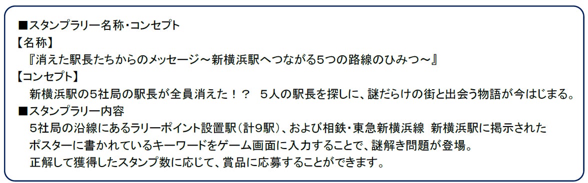 参加各社局の沿線にあるラリーポイント設置駅(合計9駅)、および相鉄・東急新横浜線 新横浜駅に掲示されたポスターのキーワードをゲーム画面に入力することで、謎解き問題が登場。探偵となって、消えた5人の駅長たちの行方捜査をしていただきます。正解して獲得したスタンプ数に応じて、賞品に応募することができます。