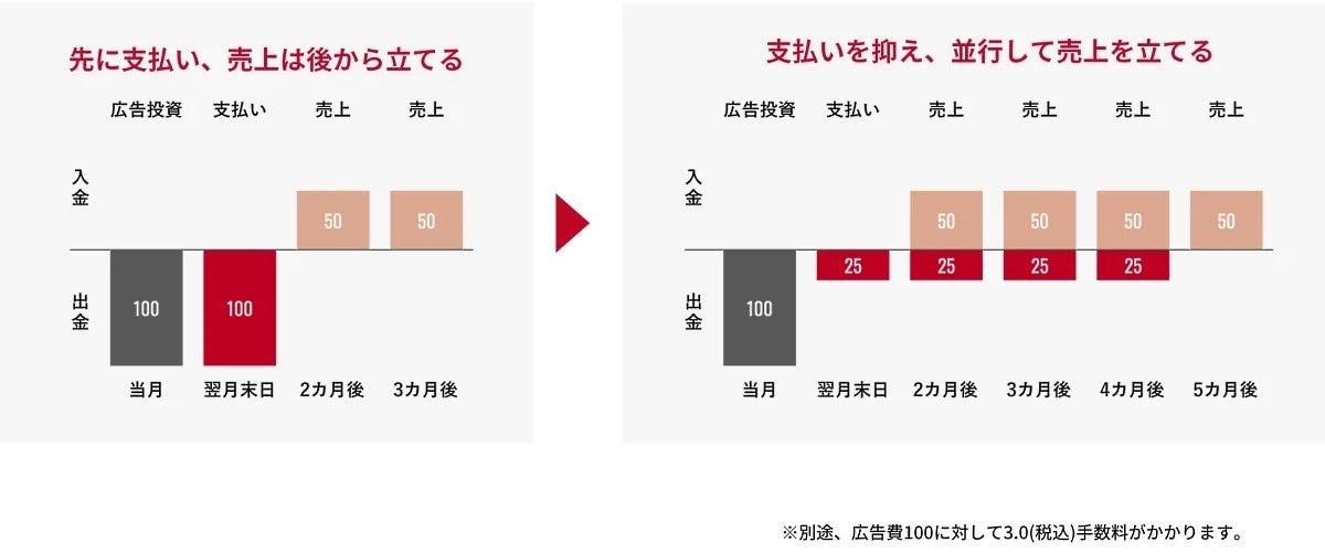 しかし、成長段階のD2Cブランドにとって広告投資は重要ではあるものの、広告出稿費用の支払いと売上が立つタイミングがずれることでキャッシュフローを圧迫することがボトルネックとなり、多くの事業者様においては広告投資へ踏み込めずにいることも事実です。その結果、予算の捻出が難しいために効果的なタイミングで広告を出稿できず、成長スピードに課題を抱える事業者様も多くいらっしゃいます。