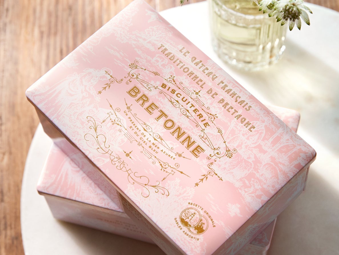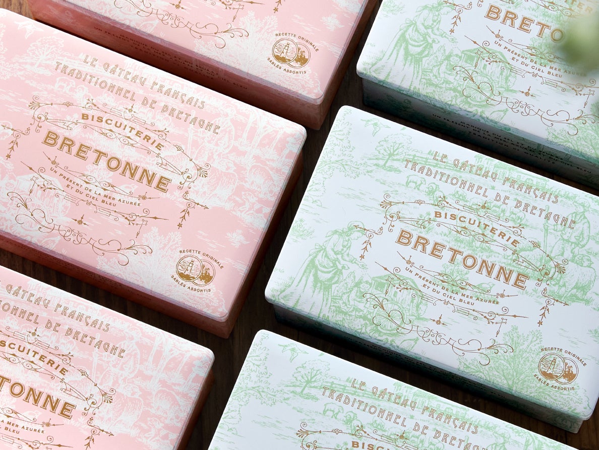 18世紀に誕生したフランスの伝統的なテキスタイルデザインで、人物や風景、天使、花などの植物柄がモチーフとして描かれているのが特徴です。今でもファブリックや洋服などに使用され、多くの方に愛されています。ブルトンヌでは今回、ブルターニュの伝統的な酪農や農村での人々の生活風景をモチーフにしたオリジナルのトワルドジュイ柄を新しくデザインし、バレンタイン・ホワイトデー限定のクッキー缶にあしらいました。通常缶のデザインとは異なる、クラシックで繊細な限定デザインをお楽しみください。