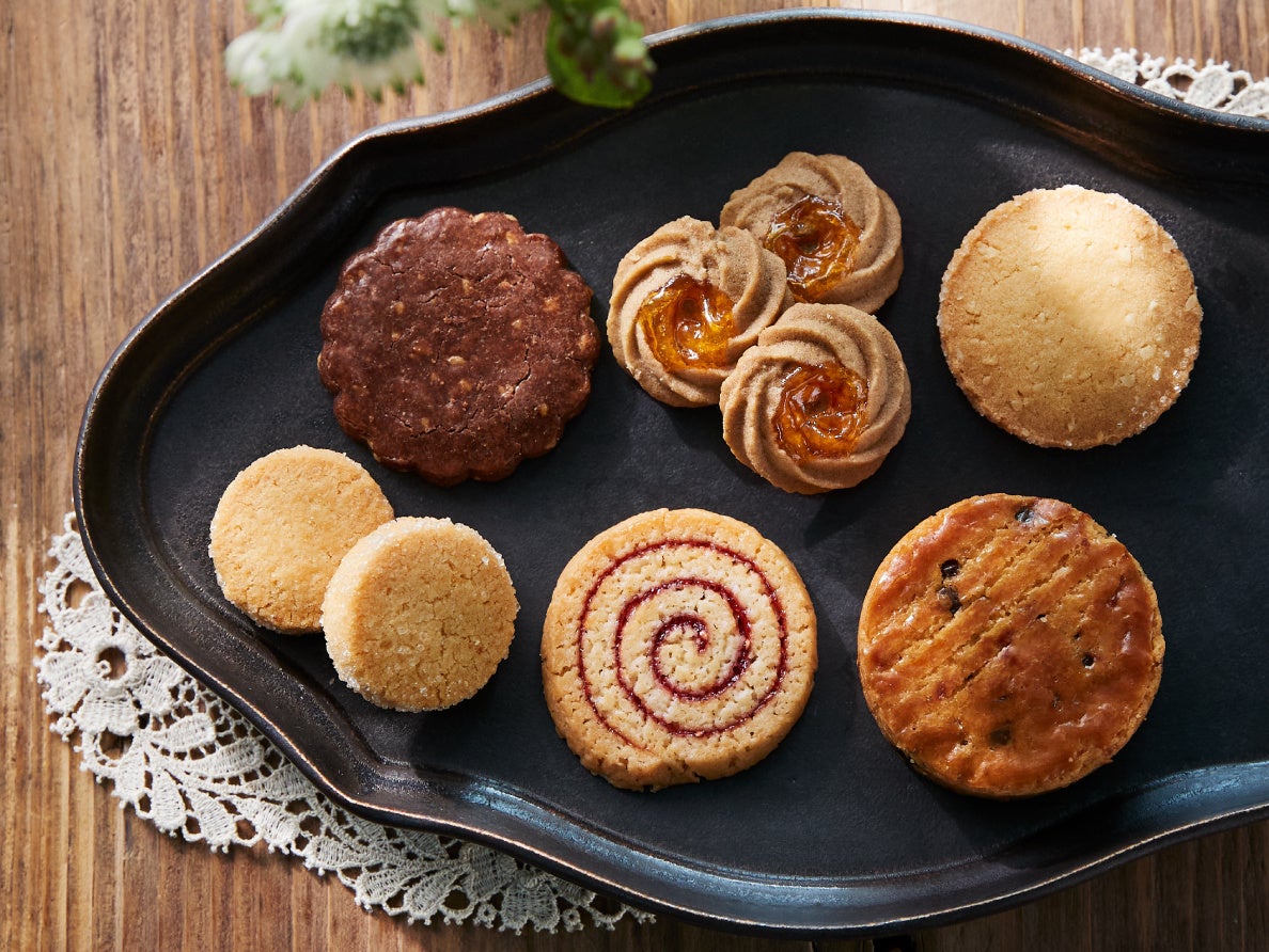 中には、毎年ご好評いただいているチョコチップ入りのガレット・ブルトンヌと、ショコラの深いコクとキャラメルにほのかな塩味を添えた「ショコラ・キャラメル」、香ばしいアーモンドを合わせた「ディアマン・アマンド」、紅茶の香りとフルーティなアプリコットの酸味が広がるジャムクッキー「紅茶・アプリコット」、爽やかにオレンジが香る「サブレ・オランジェ」の、5 つの限定サブレと定番の「フランボワーズ」を華やかに詰めています。
