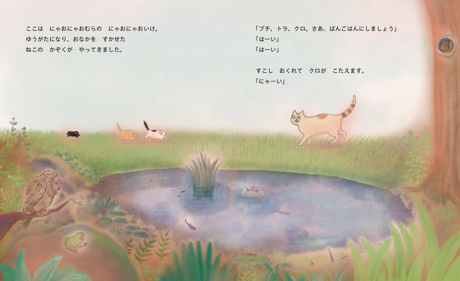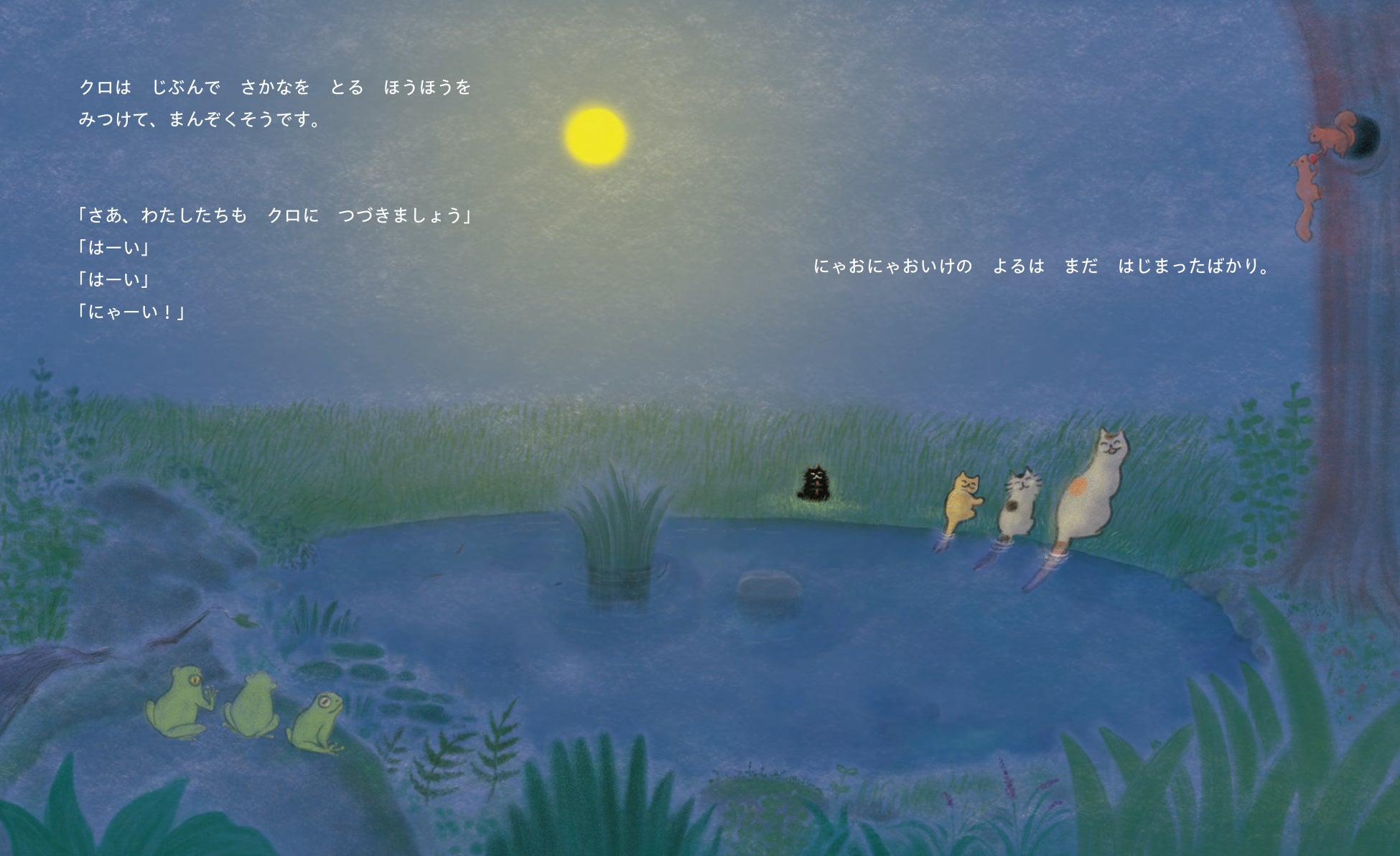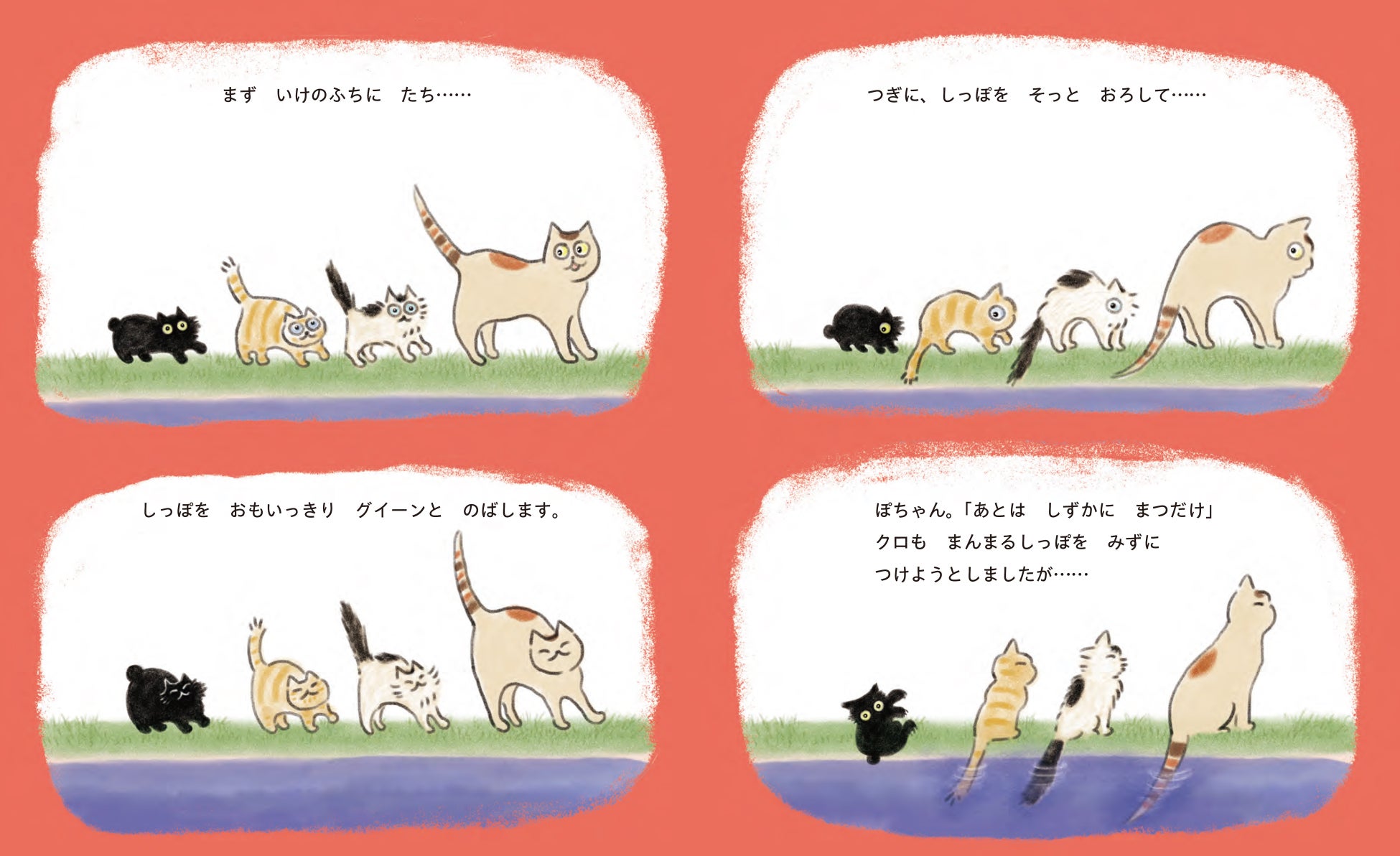 にゃおにゃお池に猫の家族が晩ご飯の魚をとりにやってきました。お母さん猫は細くて長いしっぽを池のなかにたらし、見事に魚をゲット! 「しっぽ釣り」の技を子猫たちに伝授しますが、クロのまんまるしっぽは、魚釣りには短すぎました。