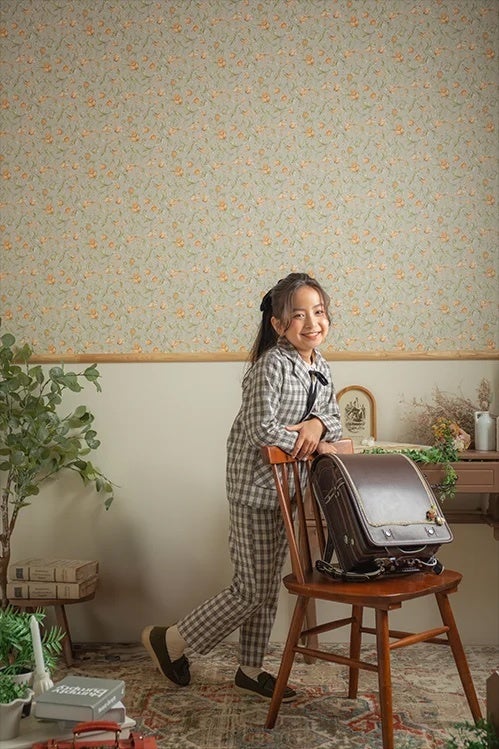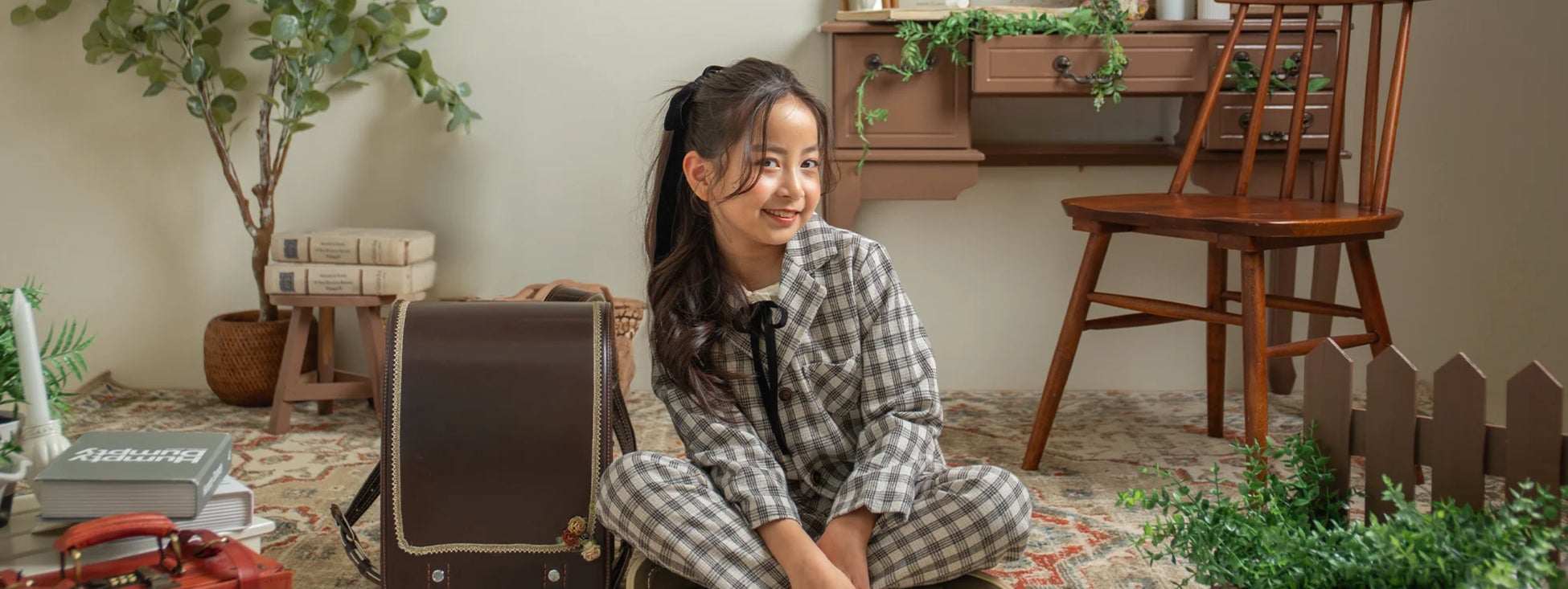 アンティークの家具や小道具を取り入れた優雅さと可愛さを兼ね備えた空間。ナチュラルベースな背景セットなので、どんなランドセルも似合います。