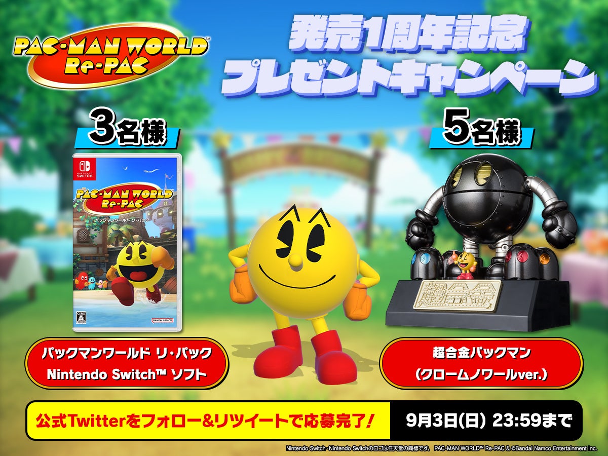 期間中に「パックマン」公式Twitterアカウント(@BNEI_PACMAN_JP)をフォロー&該当ツイートをリツイートすると、超合金パックマン(クロームノワールver.)もしくは『パックマンワールド リ・パック』Nintendo Switch™用ソフトが合計8名様に当たります。