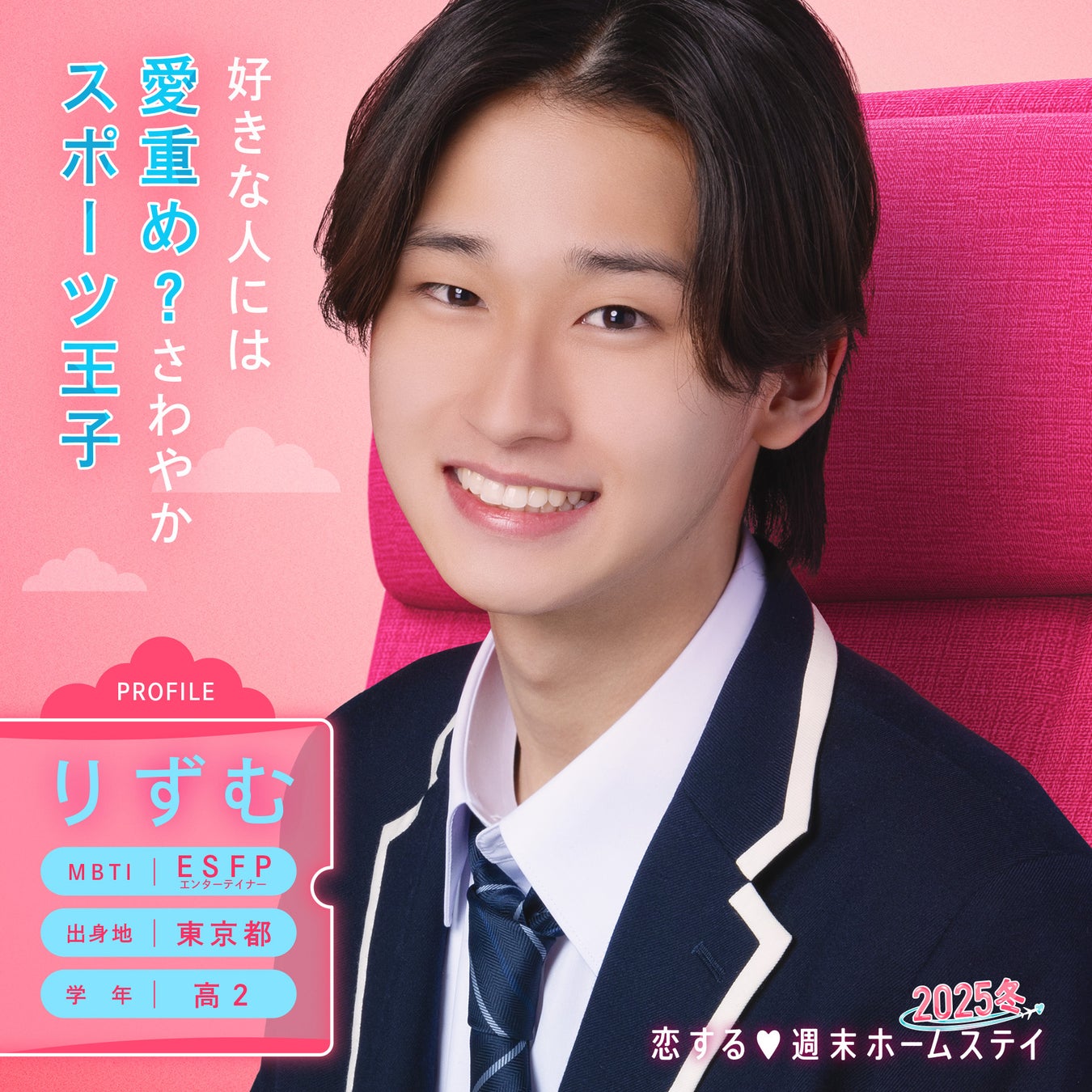このたび新シーズンに参加する男子メンバーは、第36回ジュノン・スーパーボーイ・コンテストのファイナリストのりずむ(富川 立夢/高校2年生/東京都出身)をはじめ、かいと(田代 魁音/高校1年生/東京都出身)、たいし(田上 泰至/高校2年生/和歌山県出身)、だいち(鶴ケ崎 大知/高校3年生/神奈川県出身)の4名。女子メンバーは、韓国の事務所に所属しK-POPアイドルとして活動していた経験があるうた(高校3年生/大阪府出身)をはじめ、女子高生ミスコン2024ファイナリストのミレイ(高校2年生/北海道出身)、女子小中高生に大人気のYouTube チャンネル「めるぷち」研究生のゆきな(山本 雪菜/高校1年生/大阪府出身)の3名に加え、リベンジメンバーとして『恋する♥週末ホームステイ 2024冬』に参加していた、るなっぴ(高校3年生/埼玉県出身)が2回目の登場となります。