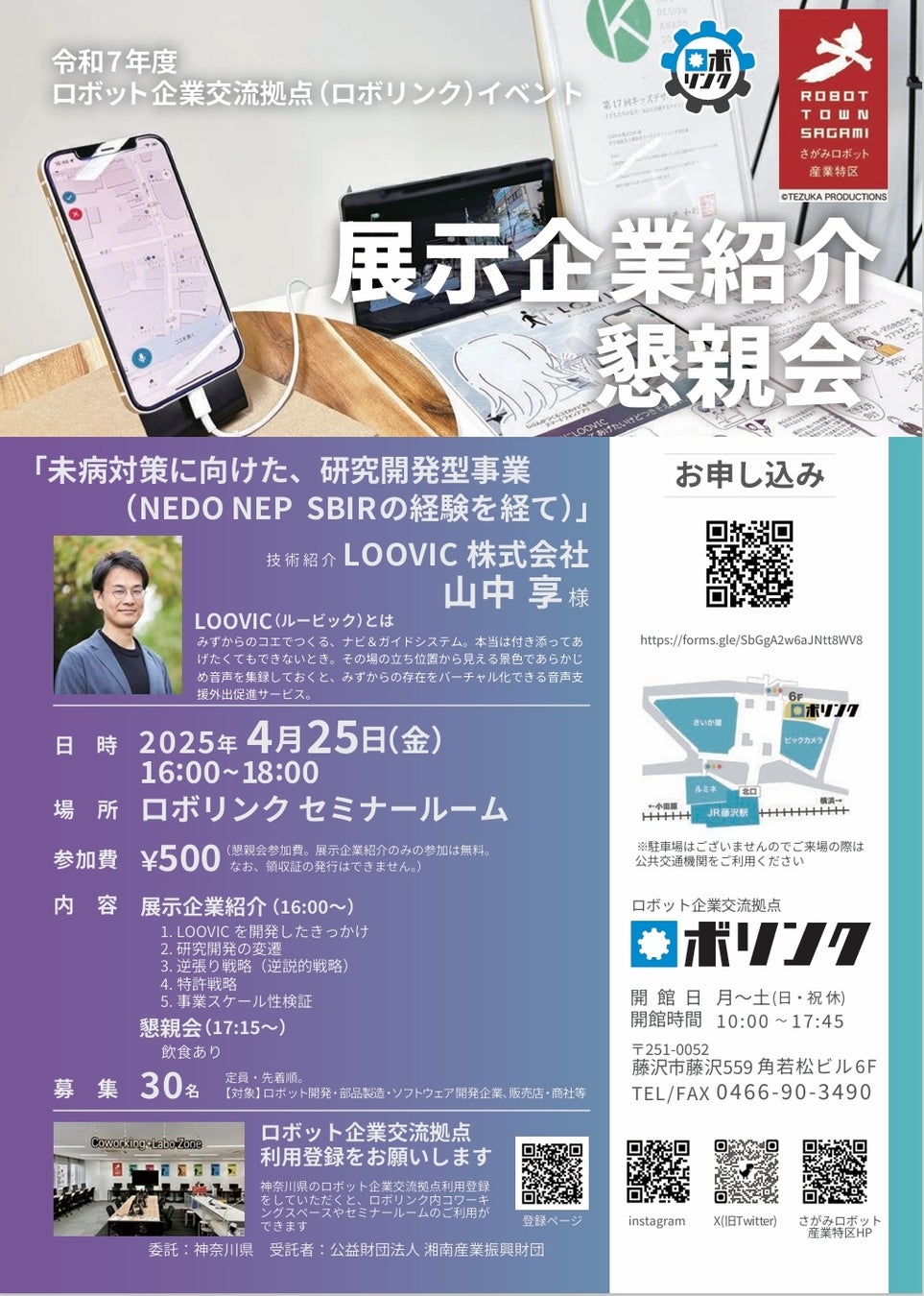 ロボット開発、部品製造、ソフトウェア開発、販売代理店、商社等、ロボット産業に携わる方や音声支援外出促進サービスの導入を検討している施設・個人の方に向けた講演会(LOOVIC株式会社による講演)・懇親会を開催いたします。