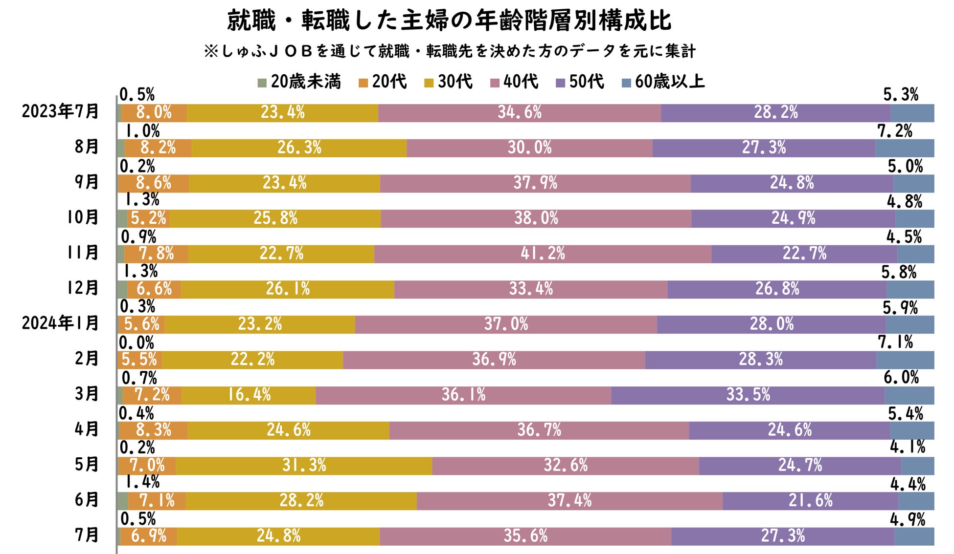 子育て層が就職活動をしづらい7月~8月に、平均年齢がグッと上昇するのは例年通りの動き。実際に年齢階層別構成比を見ると、子育て層が多いであろう30代と40代の比率は下がった一方で、50歳以上の比率は上昇し、3割を超えた。