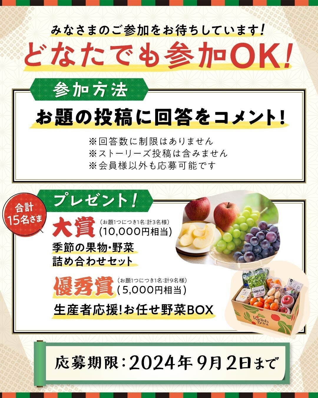 今回が初となる本取組みですが、4つのお題に対し、非常に多くの方から応募をいただき、厳正な審査の上、大賞を4作品、優秀賞11作品の合計15作品を選出しました。受賞した応募者の皆さまには、賞品としてらでぃっしゅぼーやの季節の果物・野菜の詰め合わせセット等を贈呈いたします。