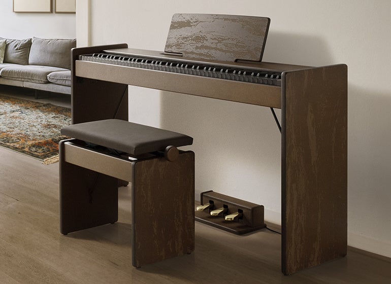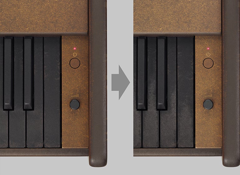鍵盤は、弾き込みの具合に応じて色が変化していきます。楽器本体に用いた木質ボードは、設置する場所の温度などの環境によって色が変化し、木部用ワックスによるつや出しが可能です。ご使用いただくほど味わい深くなる風合いをお愉しみいただけます。