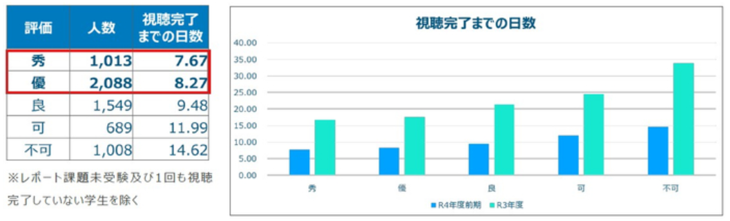 「成績」と「動画公開から何日以内に視聴したか」に相関関係があることがわかった。成績が「秀」や「優」の学生は動画が公開されてから1週間程度で見ている人が多く、「可」や「不可」の学生は1つの動画を見終わるのが、公開後10日以上たってからという分析結果が出ている。