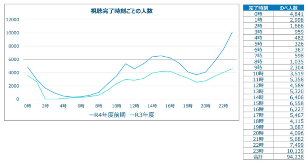 23時台をピークに0~1時と深夜帯になっても多くの学生が視聴している。昼間の11~17時も多いが、その倍ほどの人数が23時の時間帯に集中している。これは24時間いつでも受講できるオンデマンドの特性をよく表している。