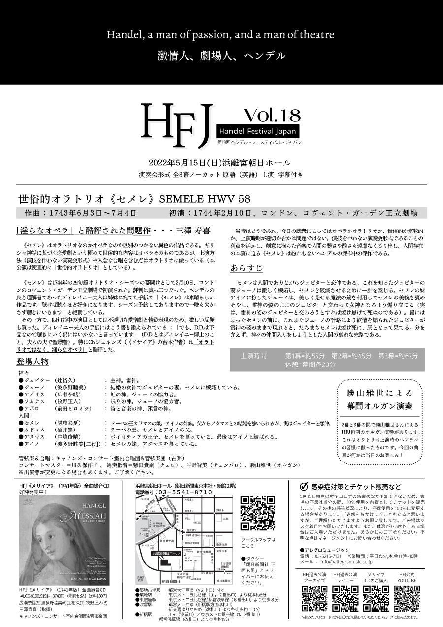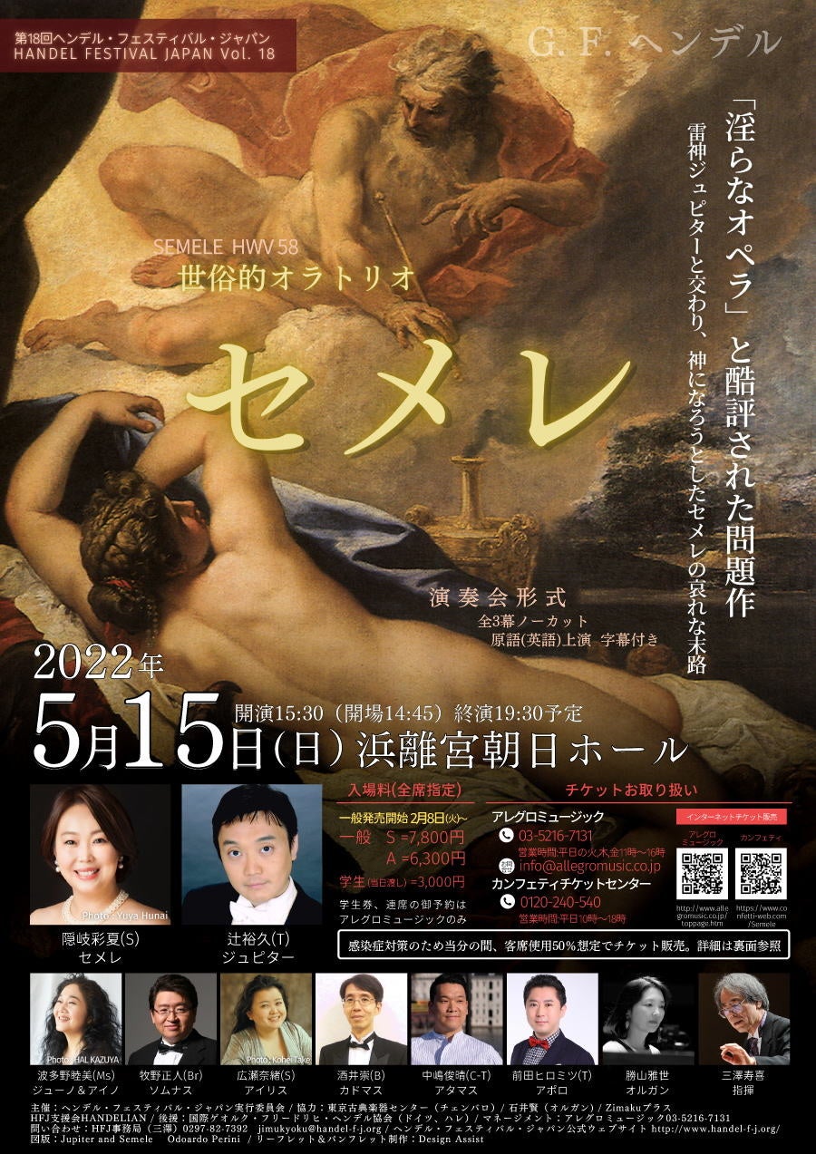 第18回 ヘンデル・フェスティバル・ジャパン 世俗的オラトリオ『セメレ』が2022年5月15日(日)に浜離宮朝日ホール (東京都中央区)にて上演されます。チケットはカンフェティ(運営:ロングランプランニング株式会社、東京都新宿区、代表取締役:榑松 ⼤剛)にて発売中です。