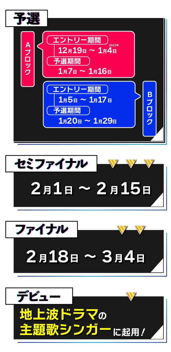 ※予選は2ブロック制。各エントリー期間は、予選Aは2022年12月19日(月)~2023年1月4日(水)、予選Bは2023年1月5日(木)~17日(水)。